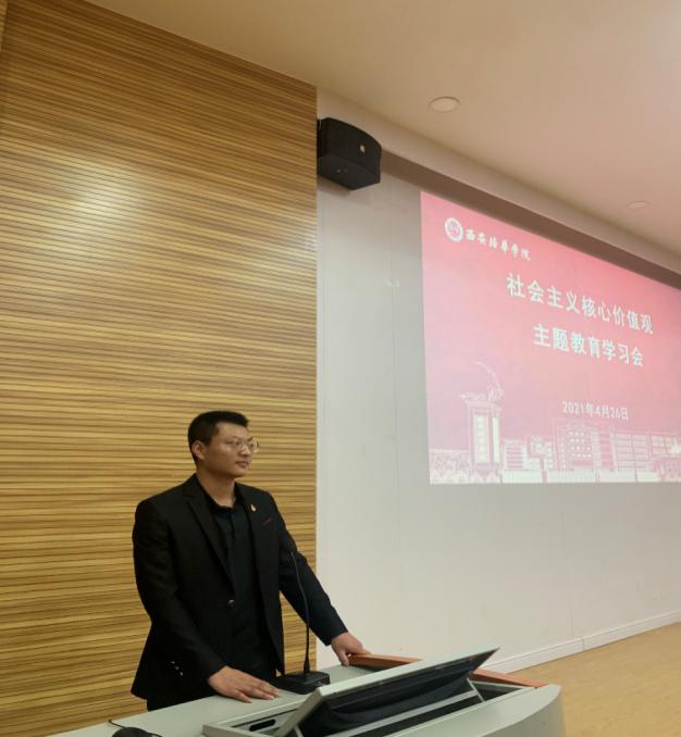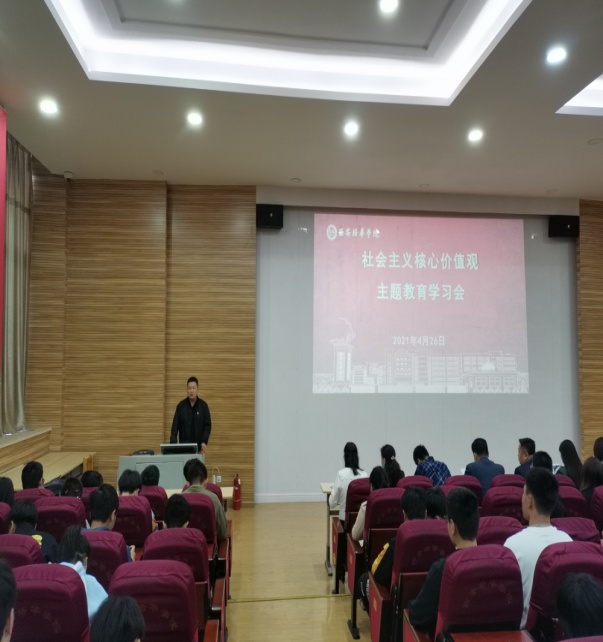 为庆祝中国共产党成立100周年,深入贯彻学习习近平新时代中国特色社会主义思想,引导学生进一步践行社会主义核心价值观,增强学生的责任感和使命感,我校党支部于2021年4月26日在格物楼J102教室召开了“社会主义核心价值观”主题教育会,党支部书记罗永辉、党务干事杜苗果及全体党员和学生代表参会,会议由团委书记蔡国强老师主持。