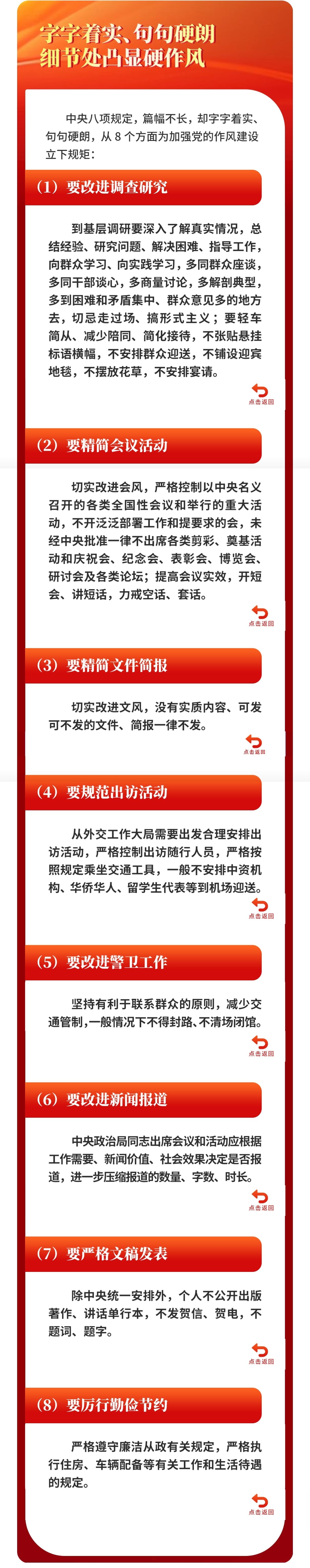 一、中央政治局全体同志要改进调查研究,到基层调研要深入了解真实情况,总结经验、研究问题、解决困难、指导工作,向群众学习、向实践学习,多同群众座谈,多同干部谈心,多商量讨论,多解剖典型,多到困难和矛盾集中、群众意见多的地方去,切忌走过场、搞形式主义;要轻车简从、减少陪同、简化接待,不张贴悬挂标语横幅,不安排群众迎送,不铺设迎宾地毯,不摆放花草,不安排宴请。