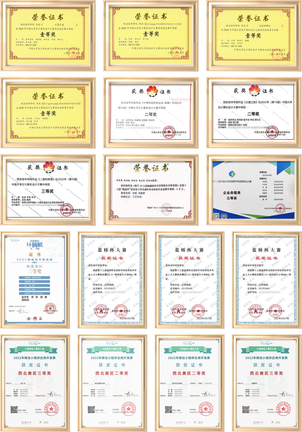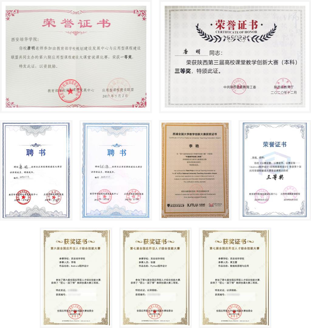 近年来,本专业获批省“1+X证书制度”(大数据平台运维、Web前端开发、计算机视觉应用开发)试点项目3项,省级精品课程1门,省级线下一流本科课程2门,校级应用型示范课程9门,校级精品课程3门。本专业教师先后获得了全国应用型课程建设大课堂说课比赛一等奖及三等奖、全国应用型人才综合技能大赛二等奖及三等奖、西浦全国大学教学创新大赛三等奖、陕西省教师计算机职业技能大赛一等奖、陕西省本科院校课堂教学创新大赛三等奖、学校应用型特色课程评比大赛特等奖,并受聘为教育部应用型课程建设大讲堂讲师团成员,多次在全国进行应用型课程建设经验推广及交流的专题报告。
