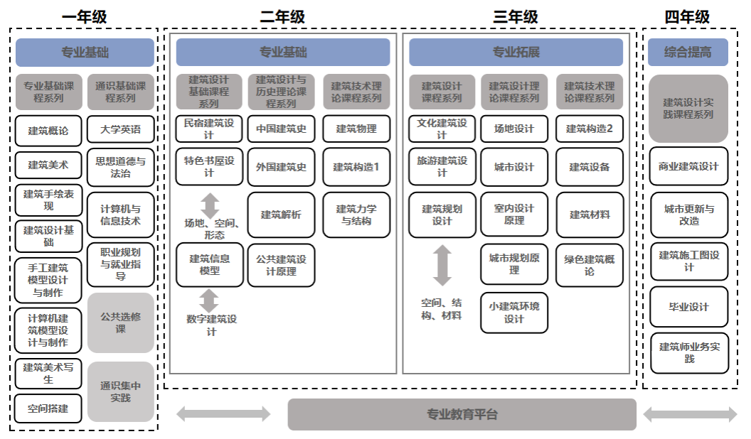 建筑设计基础、建筑设计、手工建筑模型设计与制作、建筑手绘表现、公共建筑设计原理、中外国建筑史、城市设计、建筑构造、建筑力学与结构、建筑物理、计算机建筑模型设计与制作(CAD、PS、SU、lumion)、建筑数字化设计(BIM、revit)、建筑设备等。