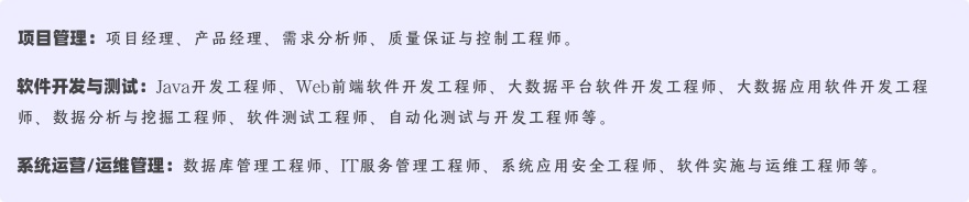 本专业学生毕业后能在技术研发企业、教育科研单位、政府部门、企事业单位及其他相关部门,从事项目管理、软件开发、软件测试、系统运营与运维及相关工作。