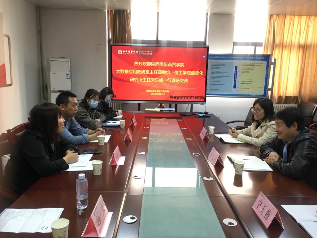 3月14日下午,陕西国际商贸学院大数据应用教研室主任郑鹏怡、信工学院信息化研究所主任宋东峰一行6人莅临智能科学与信息工程学院数据科学与大数据教研室进行考察调研。智信学院基础系主任陈文利、数据科学与大数据专业负责人刘丽景以及大数据教研室骨干教师参加了调研座谈会。