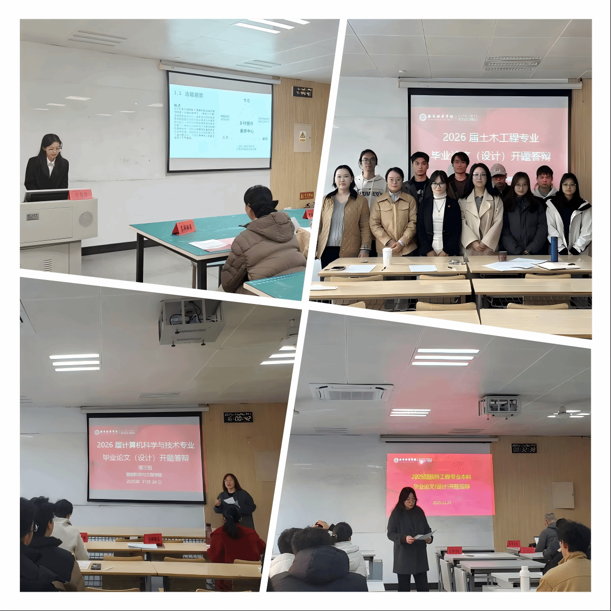 此次开题答辩顺利完成,为学生优化知识体系、提升研究能力搭建了优质平台。学生们借此对选题的研究价值、路径及难点有了更深刻全面的认识,也清晰把握了毕业论文(设计)的撰写规范、架构与质量标准,为后续推进与高质量完成筑牢根基。学院后续将强化过程管理,依托常态化检查与动态化反馈机制,为学生提供多层次学术指导与资源支持,保障毕业论文(设计)严格遵循要求,确保学生毕业论文(设计)能够按照既定目标和要求高质量完成。