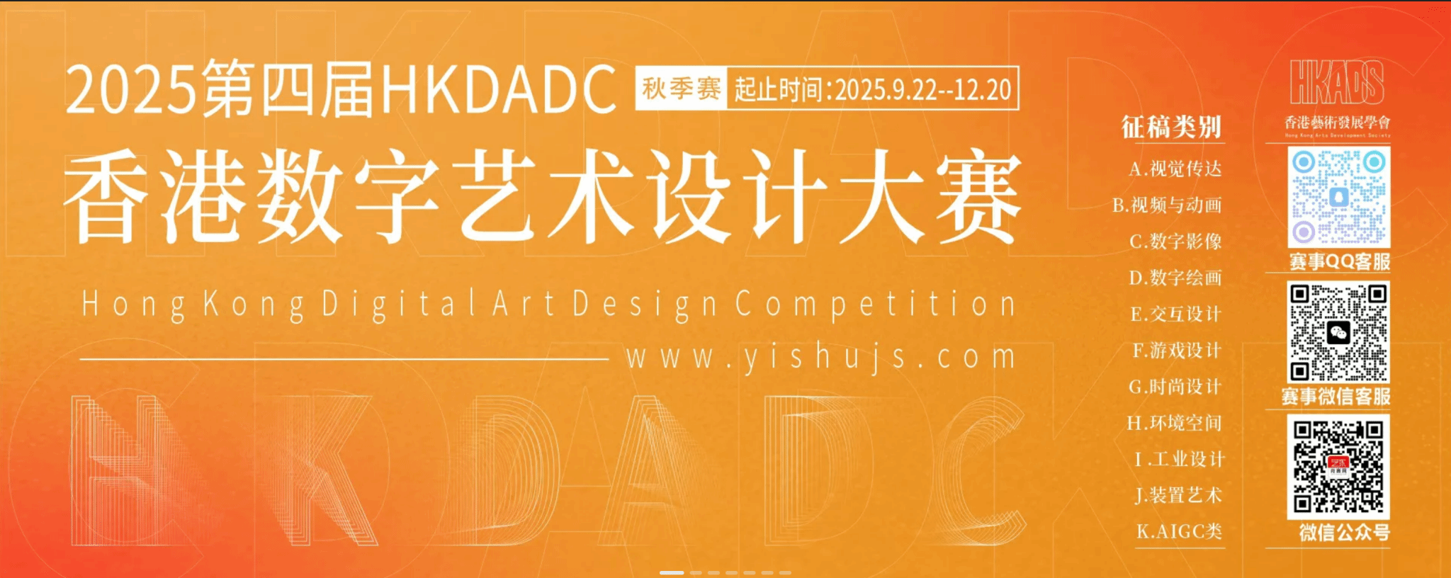 HKDADC香港数字艺术设计大赛一直以来秉承“设计改善生活”的理念,坚持艺术与技术并举,赛事立足香港面向全国在校生和数字艺术从业者开放征稿,本届赛事设有“命题”和“非命题”两个赛道,参赛组别有视觉传达、视频与动画、数字影像、数字绘画、交互设计、游戏设计、时尚设计、环境空间、工业设计等。意在通过赛事挖掘两岸三地的优秀设计师与优秀作品,为人类美好生活添砖加瓦。