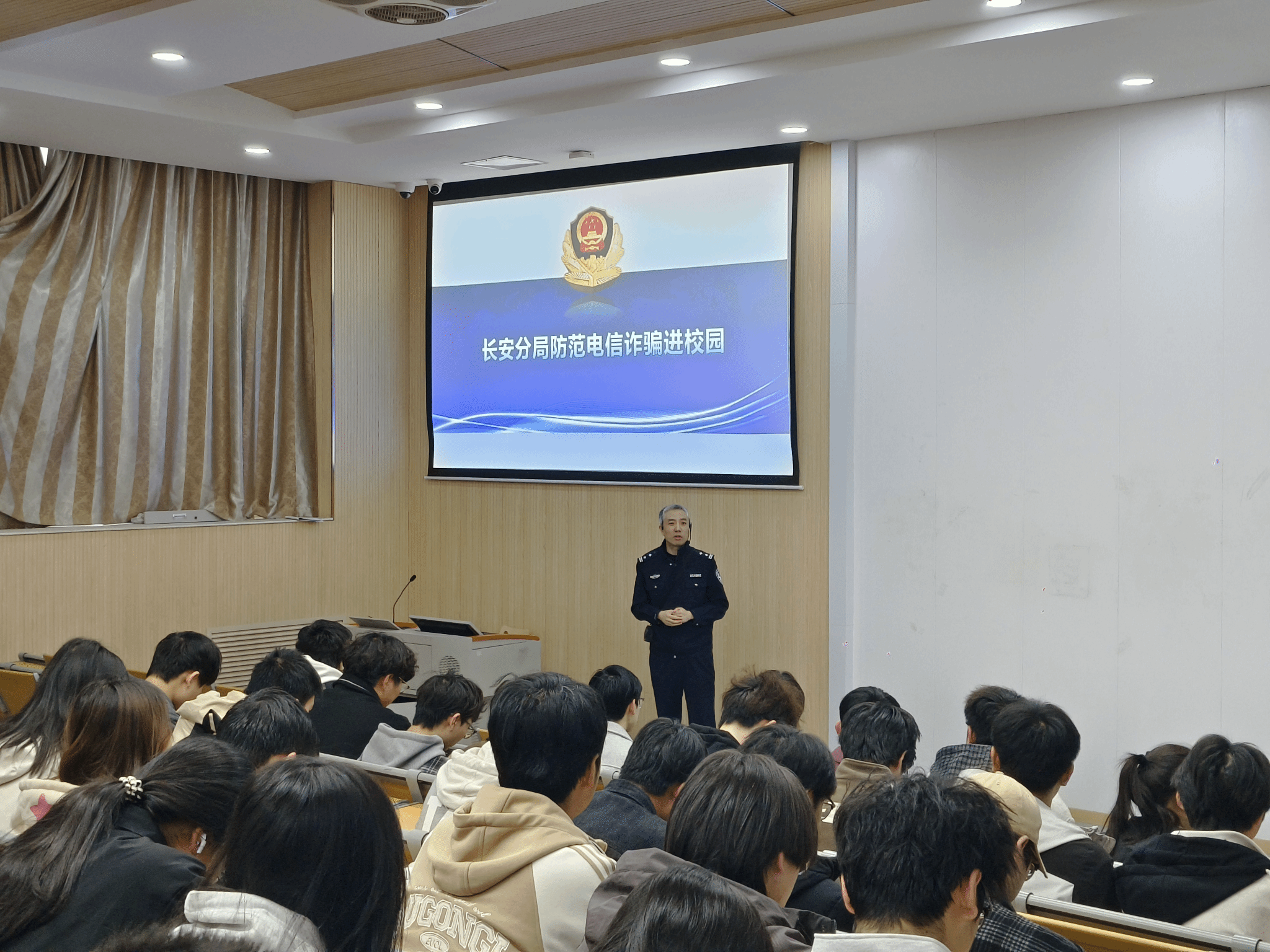 2026年3月26日智能科学与工程学院联合学校后勤服务中心(党委保卫部),在 3502 教室成功举办大学生法治教育-反诈骗专题讲座。本次讲座特邀西安市公安局长安分局民警担任主讲嘉宾,为在校学生带来了一场针对性强、干货满满的反诈普法宣讲,学院百余名学生到场聆听学习。