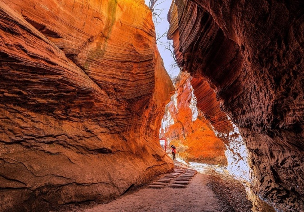 甘泉大峡谷,别称山体石峡,位于陕西省延安市甘泉县,享有“黄土高原自然地缝奇观”之美称,峡谷主要分布于甘泉县下寺湾、桥镇、东沟等地,由大小120余条峡谷组成,是典型的地埋式峡谷,丹霞地貌。甘泉大峡谷的主要景点有桦树沟峡谷、龙巴沟峡谷等。由于红砂岩在不同季节的含水量不同,对光的吸收和折射率也不一样,一年四季会显示不同的色彩。