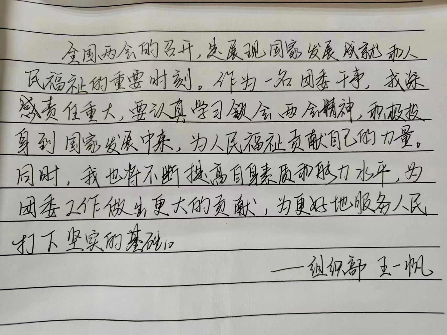 2024全国两会正式开幕,我们也更加关注两会。关注源于政府对民意的尊重。关注源于两会日益透明开放。关注源于人民对党和政府的信任。关注源于对美好未来的信心。在两会中,我们看到了中国特色社会主义民主的热度,也看到了亿万中华儿女的巨大协力。这份热度,必将催生春暖花开的中国。这份协力,必将创造撼动世界的奇迹。作为团委的一名干部我们也凭借自己的力量为我们的同学为我们的校园贡献出自己的一部分。也在随后的日子里,不忘初心,团结带领广大青年,投身国家建设,为建设美丽中国而努力。