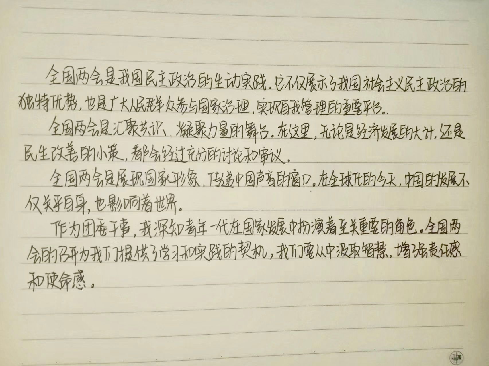全国两会的召开是中国政府对2024年及未来工作的规化,是对中国人民的幸福生活的重视牵挂,是对国家发展的精确统筹,是中华民族伟大复兴事业的一记强心针。作为新时代的青年,学习两会精神,明确自身规划,树立远大目标,跟随党和国家的脚步,为国家社会在各方面建设做出自己的贡献。