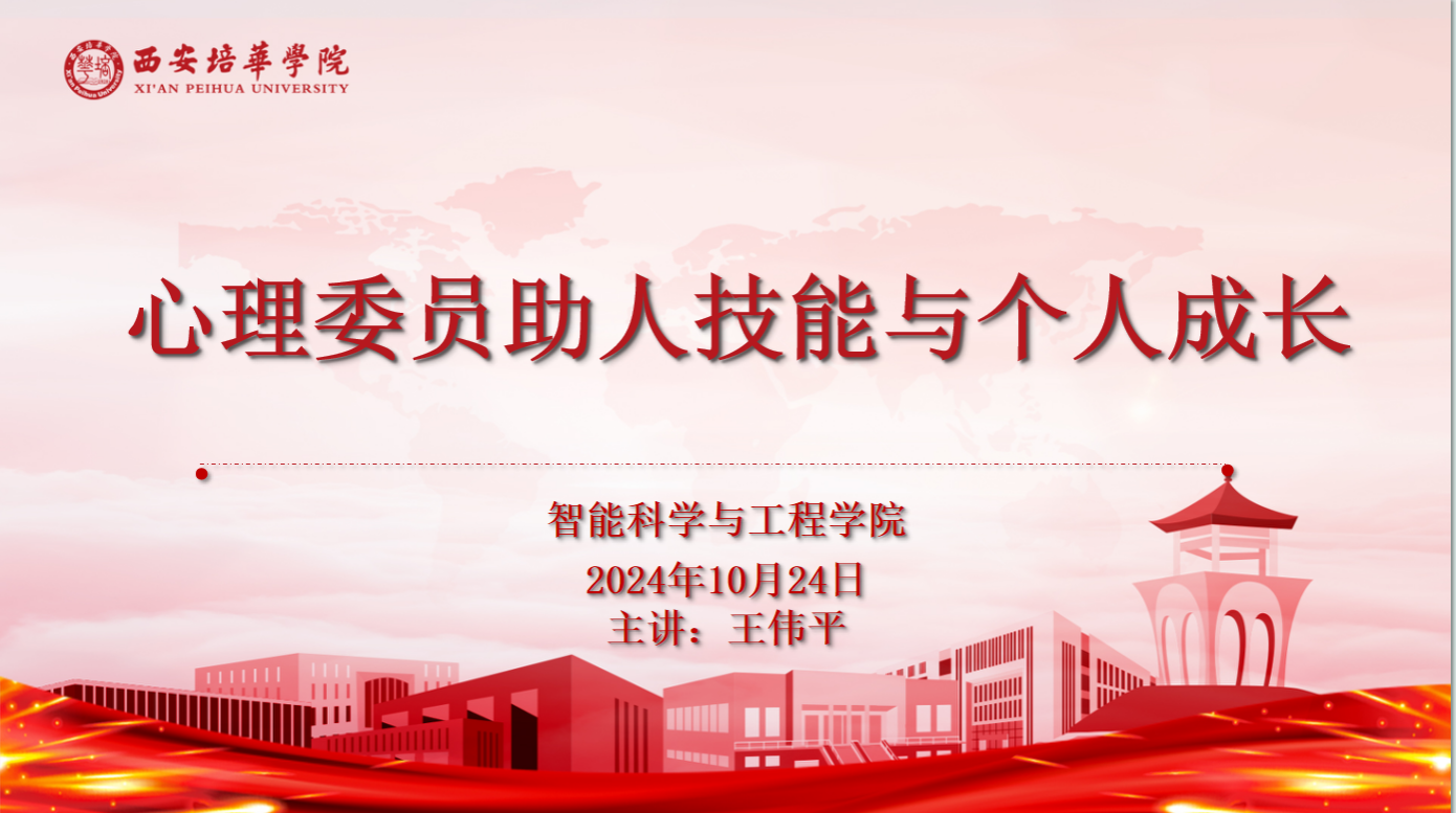 2024年10月24日,智能科学与工程学院举办了第一场主题为“心理委员助人技能与个人成长”的心理委员培训。本次培训由智能科学与工程学院党委副书记王伟平主讲,旨在提升心理委员的专业素养和助人技能,以更好地服务于学院学生的心理健康。