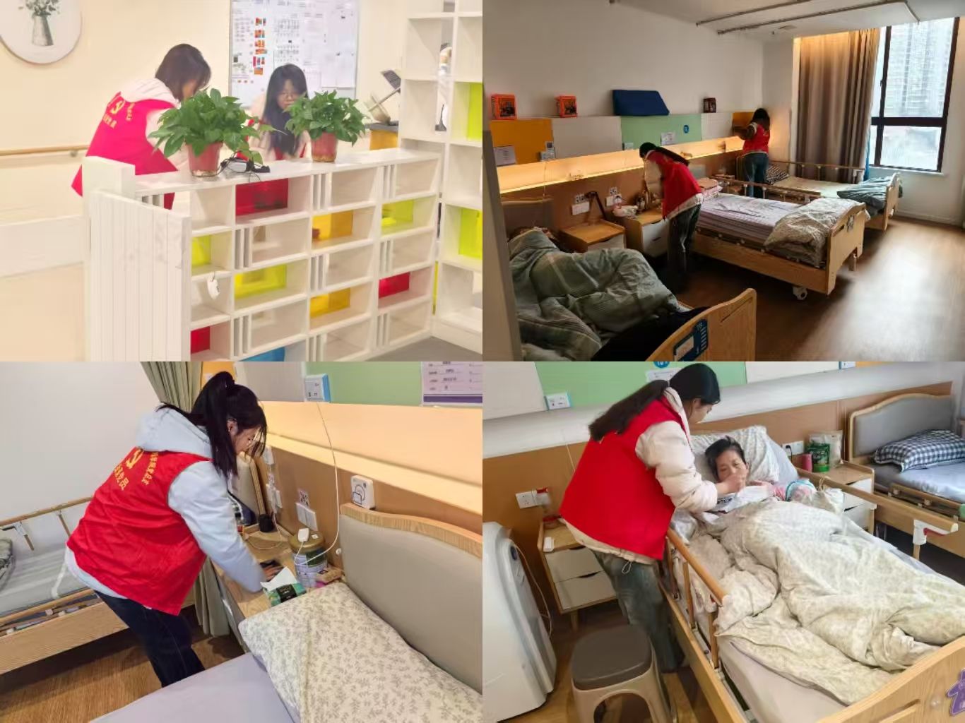 活动开始,志愿者们便迅速投入到环境清洁工作中。大家分工协作,有的擦拭床头、窗台,不放过任何一处角落;有的细心整理老人的床铺,将被褥叠放得整整齐齐;还有的仔细擦拭着公共区域的置物架,让整个空间焕然一新,为养老院的老人们带来更好的干净整洁的生活体验。每一个弯腰的身影,每一次细致的擦拭,都饱含着对老人们的关爱。洁净的环境不仅让老人们住得舒心,更让他们感受到了家一般的温暖。