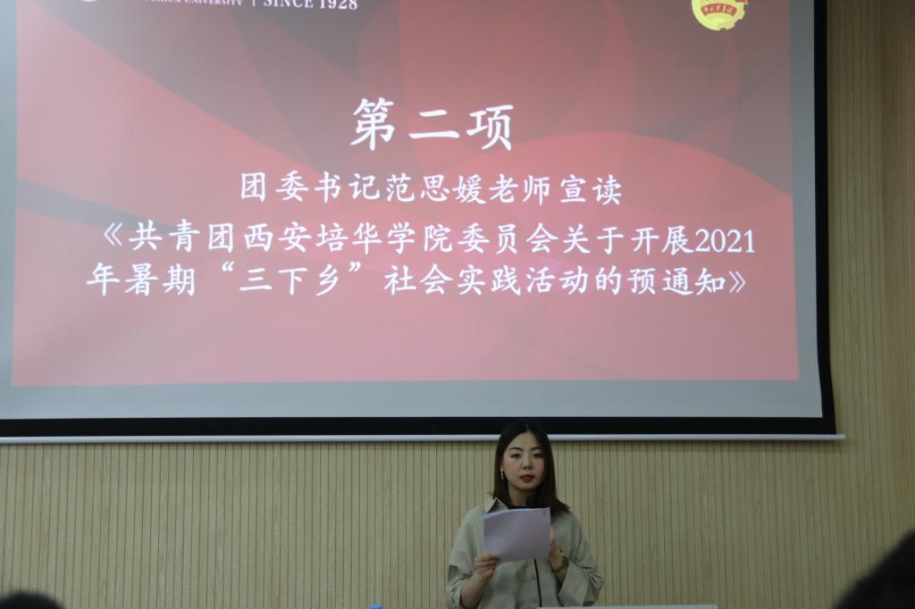 二.团委书记范思媛老师宣读《共青团西安培华学院委员会关于开展2021年暑期“三下乡”社会实践活动的预通知》;