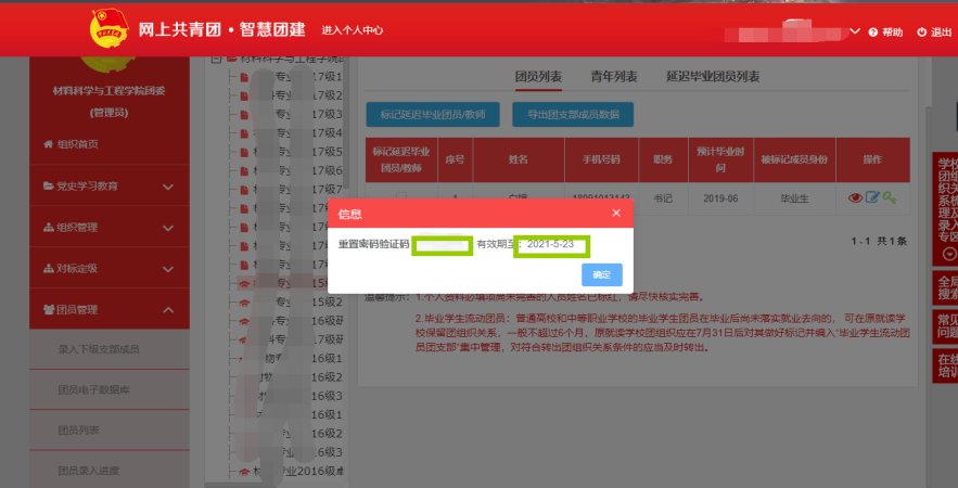 [3]团支书获得团员所需“重置密码验证码”后,团支书自行发送给团员个人即可(同时提醒需修改密码团员该验证码有效时间仅为两天,告诉其尽快修改)。