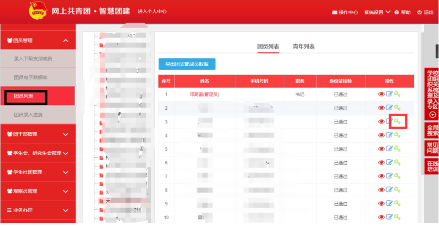 [2]组织管理员(团支书)接到团员个人联系申请后登录自己智慧团建系统在团员列表处点击“小钥匙”获得该团员修改密码所需的“重置密码验证码”。