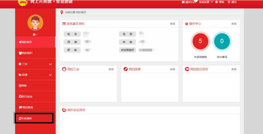 页面左侧列表点击【关系接转】。选择申请转入组织及转接原因并提交,等待团支部管理员和院团委管理员审核。