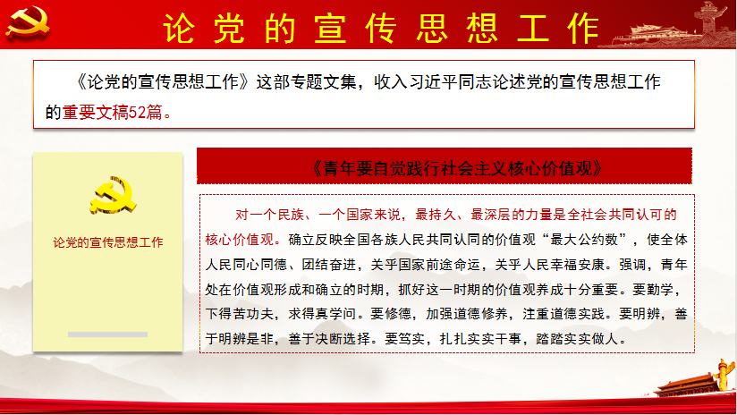 院党总支宣传委员王伟平领学《论党的宣传思想工作》。中共中央党史和文献研究院编辑的习近平同志《论党的宣传思想工作》一书,收入习近平同志2013年8月19日至2020年2月23日期间关于党的宣传思想工作的重要文稿52篇。本次共同学习了《新时代中国特色社会主义思想和基本方略》、《青年要自觉践行社会主义核心价值观》、《培养德智体美劳全面发展的社会主义建设者和接班人》、《思政课是落实立德树人根本任务的关键课程》、《做好新冠肺炎疫情防控宣传教育和舆论引导》等内容。