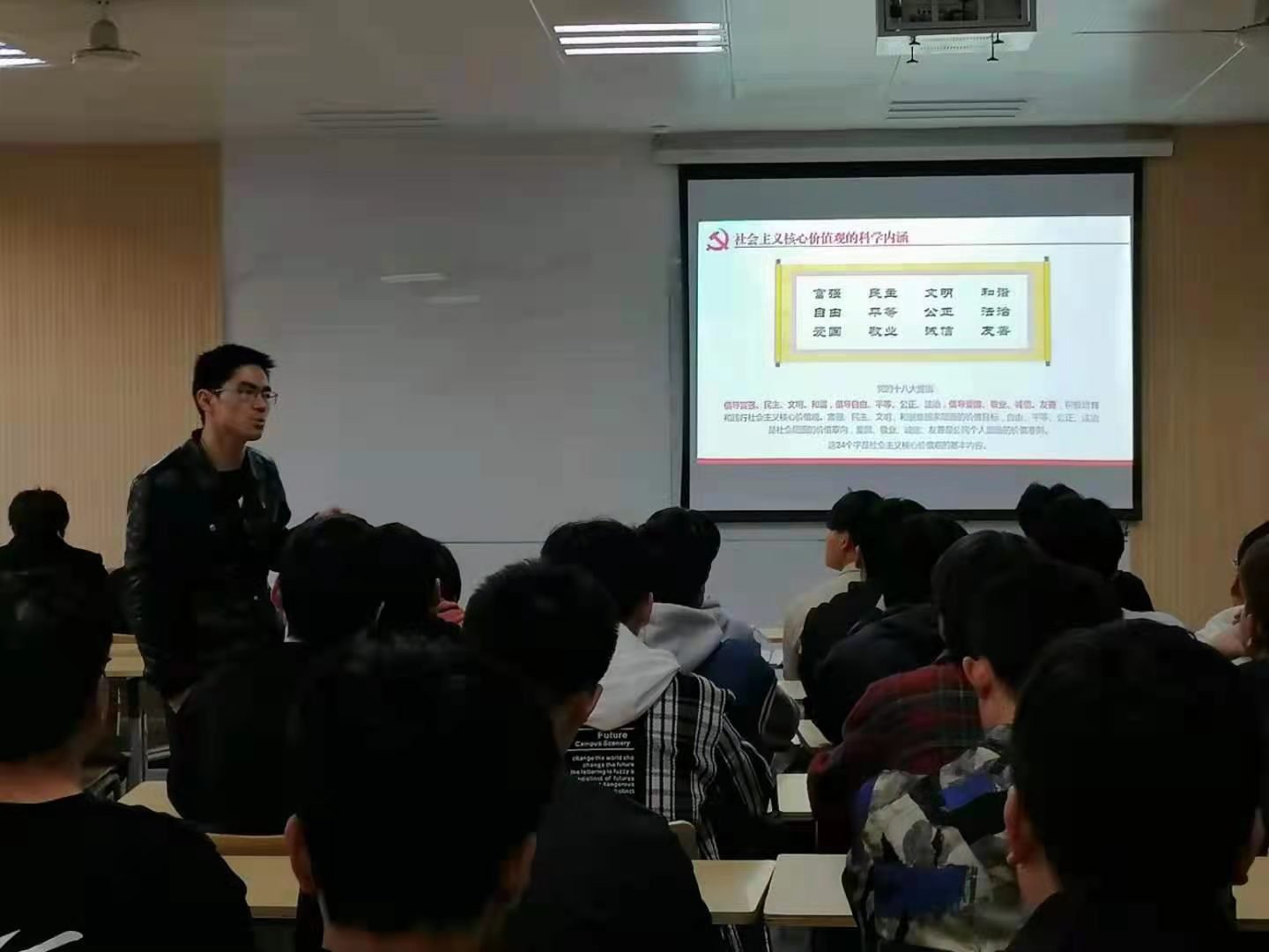 党的十八大报告用24个字分三个层次精辟的概括了社会主义核心价值观的内涵,即是:从国家层面看,是富强、民主、文明、和谐;从社会层面看,是自由、平等、公正、法治;从公民个人层面看,是爱国、敬业、诚信、友善。社会主义核心价值观是中国特色社会主义的主流意识形态,是公民思想道德建设的核心,是当代青年正确的价值取向。作为当代大学生,如何大力践行社会主义核心价值观,我院于2021年4月5日晚通过主题班会的形式进行了详细的宣传教育,使学生们更加树立正确的价值观,明确奋斗目标,凝心聚力,为实现中华民族伟大复兴的而努力奋斗。