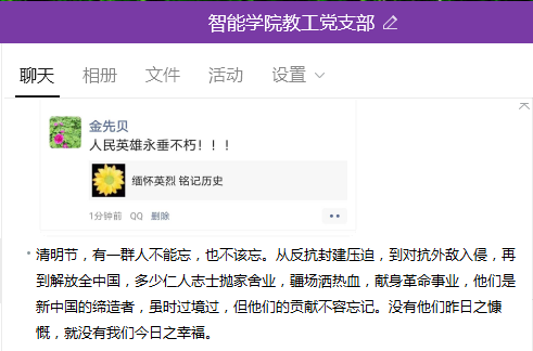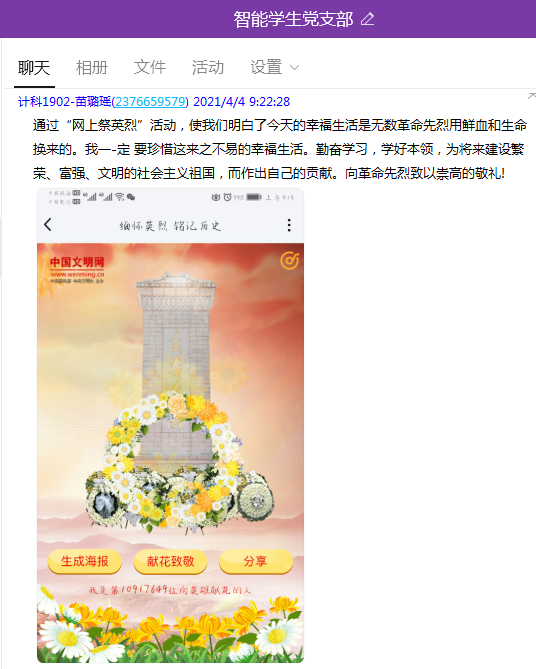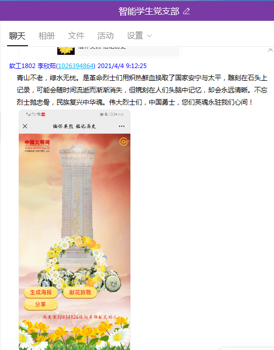 清明节期间,我院党总支教工支部和学生支部开展“缅怀英烈铭记历史”--网上祭英烈活动,缅怀革命先烈,传承英烈精神,激发师生爱国情怀,发扬红色文化!