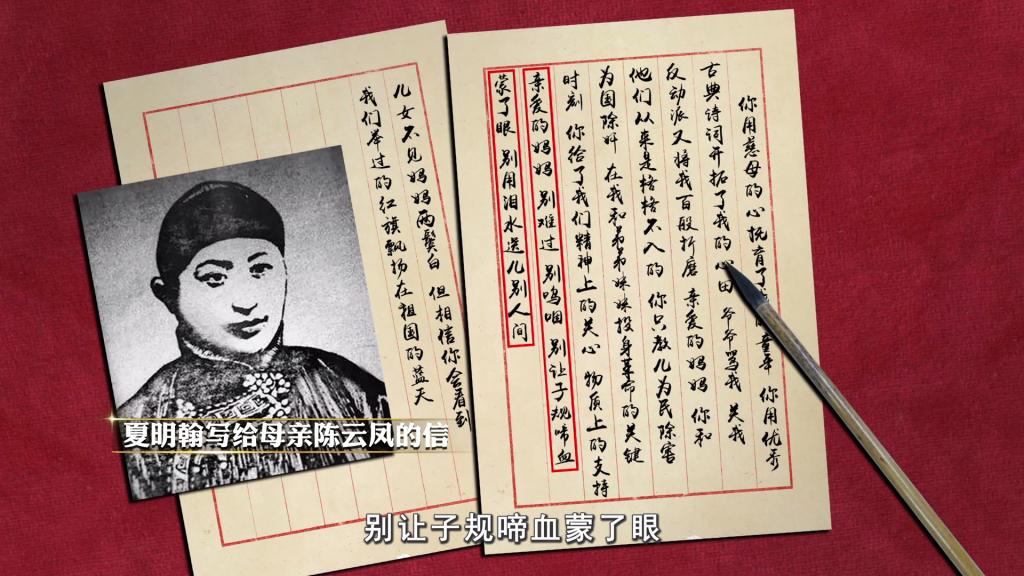 在给母亲的信中,夏明翰写道:“亲爱的妈妈,别难过,别呜咽,别让子规啼血蒙了眼,别用泪水送儿别人间。”