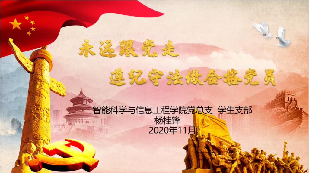 本次党课共分为党章党规法律法规教育、牢记入党誓词、坚持合格党员标准、尊法学法守法用法四个部分。旨在于让同学们坚定理想信念,秉持严实作风,成为一名合格的共产党员,永远跟党走。