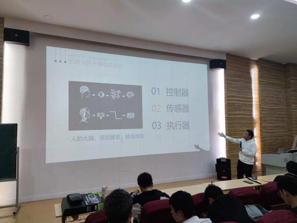 接下来是计算机科学与技术1902班的吴勇学长。他为大家带来的是当下最热门的计算机话题——人工智能,他从人工智能讲解计算机实现智能的原理、制造人脑智能的计算机,使计算机能实现更高层次的应用。另外还提到,数学在人工智能方面有很大的作用,所以学好高等数学对我院学生来说是非常重要的。分享过程中,为了活跃气氛,他用计算机编程一个登录界面和机甲大师连一起,让大一新生亲自操作,让他们感受其中的乐趣。