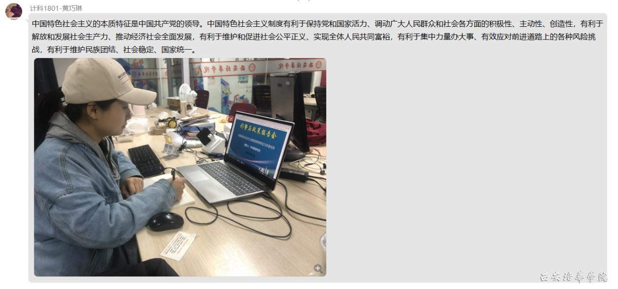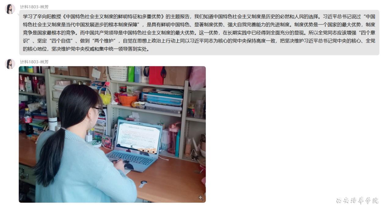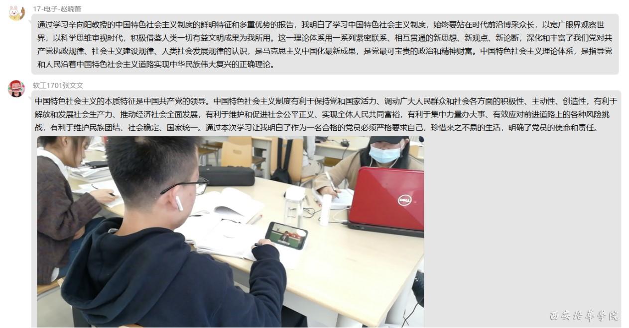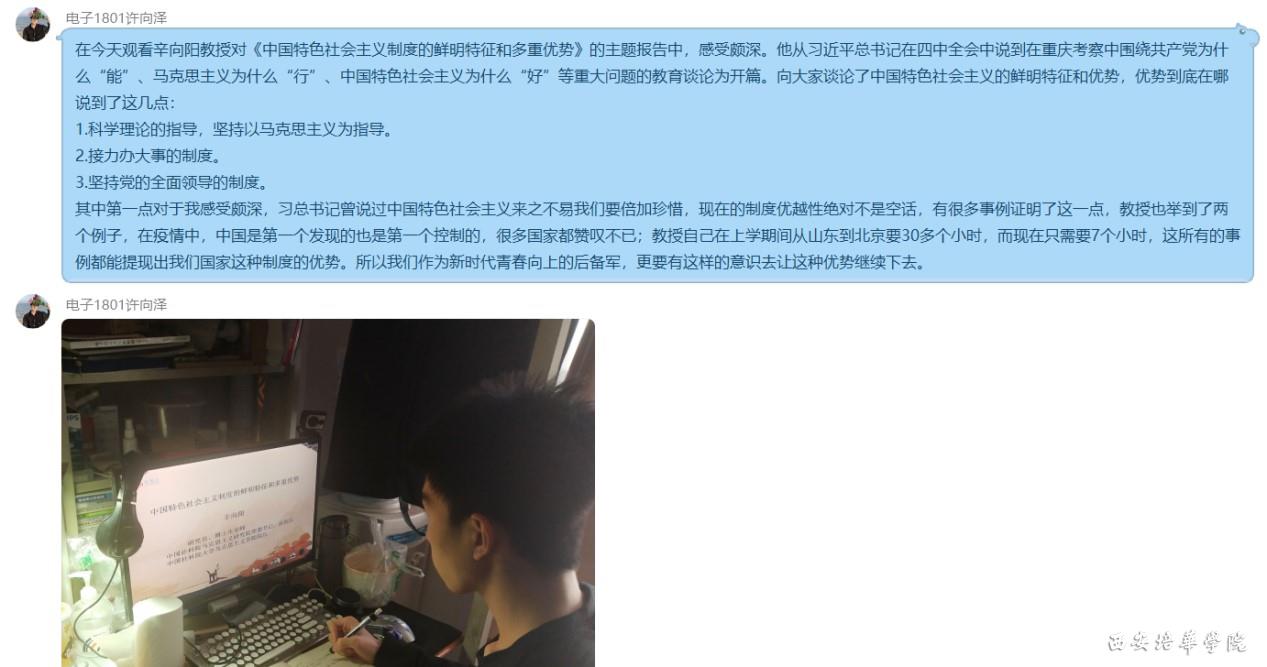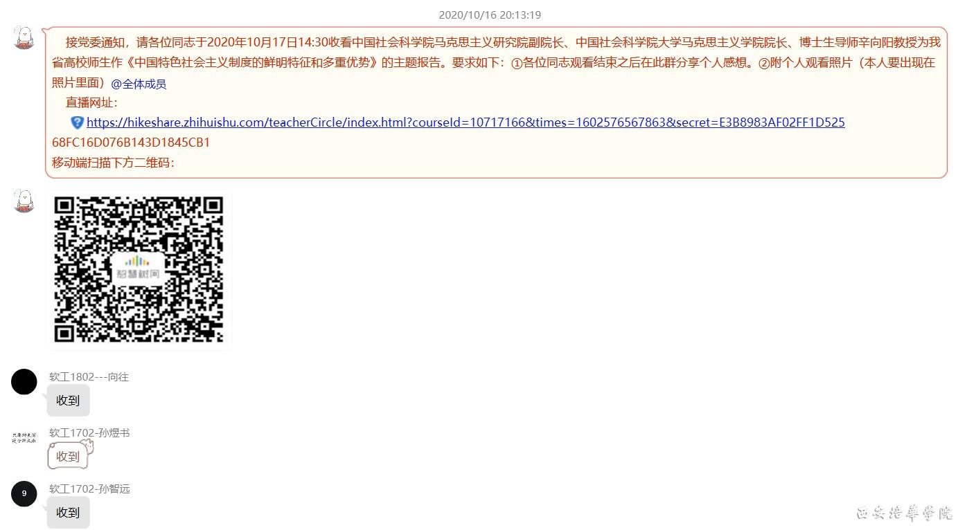 为推进习近平新时代中国特色社会主义思想进教材、进课堂、进头脑,引导广大师生深刻认识中国特色社会主义制度的显著优势,省委教育工委委托陕西大学生形势政策教育信息中心邀请中国社会科学院马克思主义研究院副院长、中国社会科学院大学马克思主义学院院长、博士生导师辛向阳教授为我省高校师生作线上《中国特色社会主义制度的鲜明特征和多重优势》主题报告,我院党总支组织师生于2020年10月17日下午14:30进行观看学习并在QQ群里分享收看心得。