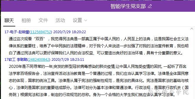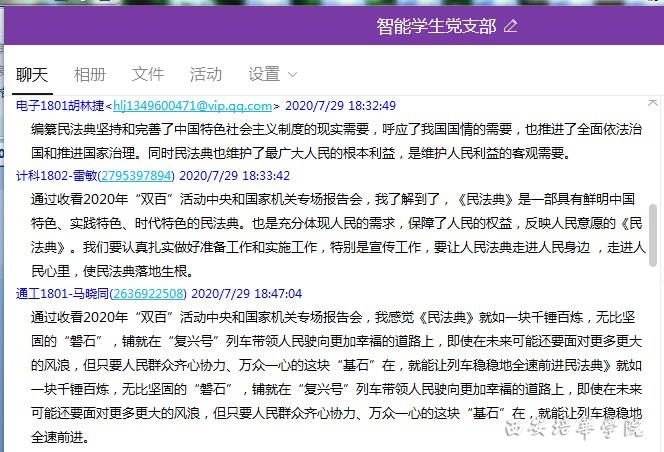 2020年7月29日,我院党总支组织全体师生党员收看2020年“双百”活动中央和国家机关专场报告会,各支部党员积极响应,利用媒体平台进行直播或回播收看并在党员QQ群中畅谈收看心得。