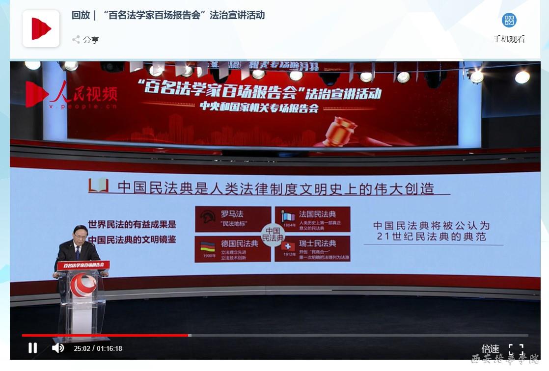 本次报告会以宣传贯彻民法典为主题,中国法学会党组书记、常务副会长陈训秋主持报告会,中国法学会党组成员、学术委员会主任张文显作报告。报告会指出,民法典是新中国成立以来第一部以“法典”命名的法律,是新时代我国社会主义法治建设的重大成果,在中国特色社会主义法律体系中具有重要地位,是一部具有鲜明中国特色、实践特色、时代特色的民法典,为新时代坚持和完善中国特色社会主义制度、实现“两个一百年”奋斗目标、实现中华民族伟大复兴中国梦提供了完备的民事法治保障。
