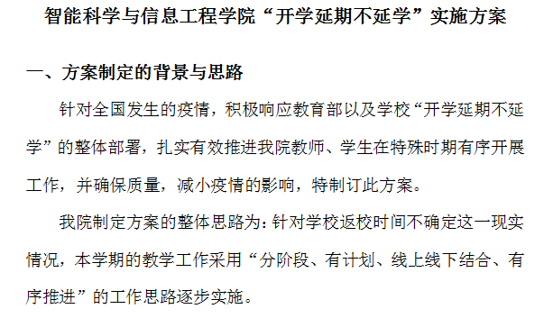 为贯彻《西安培华学院2019-2020学年第二学期“开学延期不延学”实施方案》精神,智能科学与信息工程学院多次召开线上会议,充分落实线上教学实际要求,制定了《智能科学与信息工程学院“开学延期不延学”实施方案》,积极开展线上教学的各项准备工作,让在线教学“不掉线”,打响网络授课的新战“疫”。