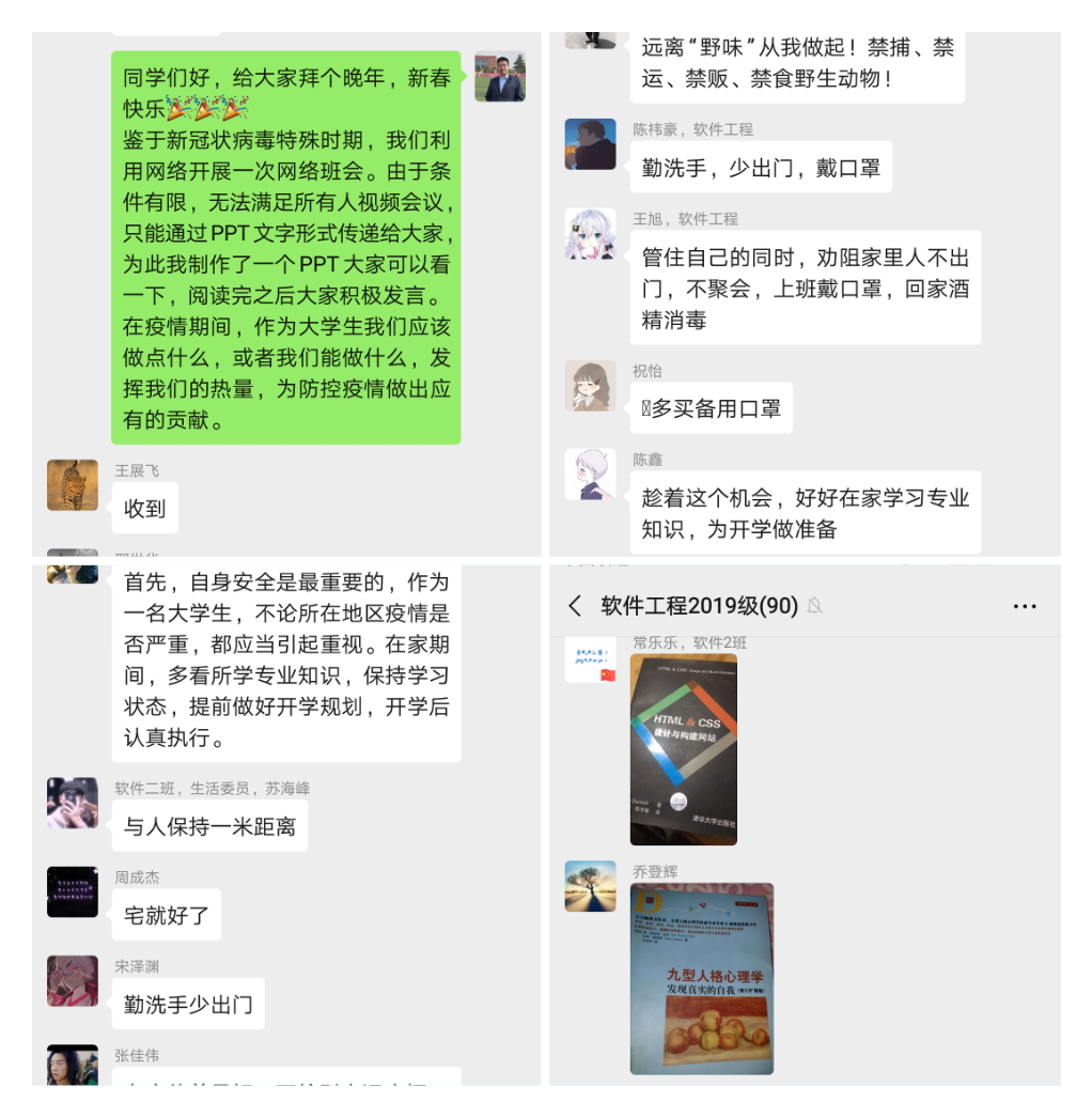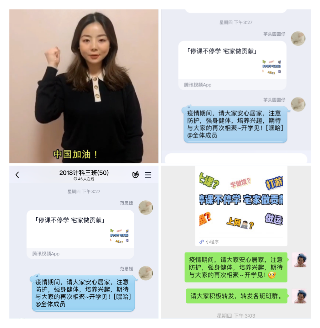 身为大一年级的辅导员姚诗雨通过班级QQ群召开线上班会,她说,现在是抗击疫情的关键时期,一批又一批勇敢的逆行者迎难而上,一件又一件感人的故事催人泪下令人鼓舞。疫情当前,没有一个人可以置身事外,而我们每一位同学现在要做的就是居家不外出,利用这段时间多陪陪父母,多读几本书,多看看专业课知识,保护好自己,让国家、逆行者们努力不要白费。