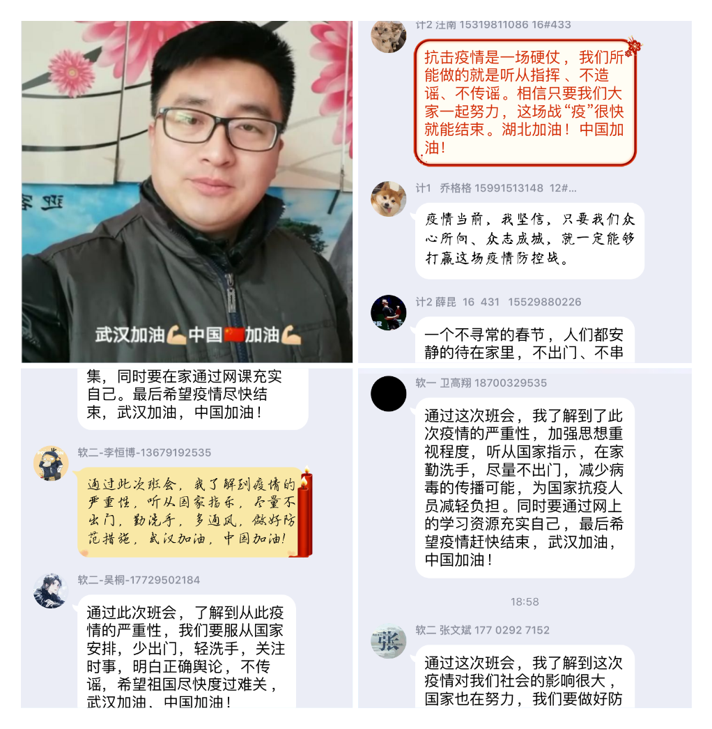 王伟平老师讲到,作为当代青年的我们应该有所担当,而作为一个中国人我们更要怀以最真挚感情,祝愿我们的祖国,还有那些为祖国献身的英雄们,他们把自己宝贵的时间奉献给了祖国,而我们应该在背后默默地支持他们,一切行动听指挥,遵守防控疫情的各项规章制度,不信谣、不传谣。同学们纷纷表达了自己对疫情防控的认识并对在本次疫情中默默付出的所有工作人员的祝福。