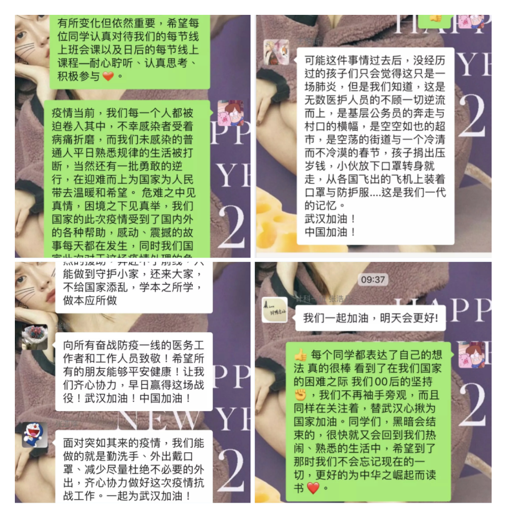 姚老师还为同学们分享几篇文章,她希望每个人都可以讲讲这场对“战役”见解。同学们表示,“疫情当下,我们做不了轰轰烈烈的援助,奔赴不了前线,只能做到守护小家,不给国家添乱,学本之所学,做本应所做”“向所有奋战防疫一线的医务工作者致敬!武汉加油!中国加油!”姚老师告诉同学们,黑暗终将会结束,很快就又会回到我们热闹、熟悉的生活中,希望到了那时我们不会忘记现在的一切,更好的为中华之崛起而读书。