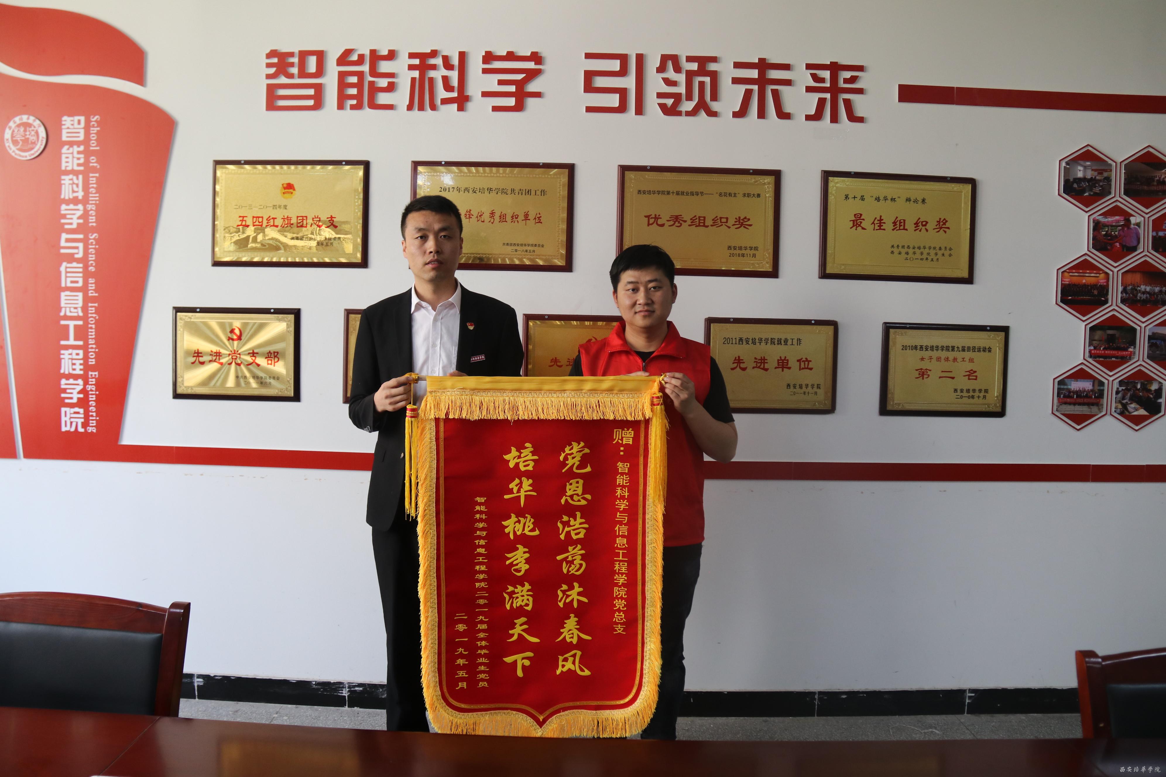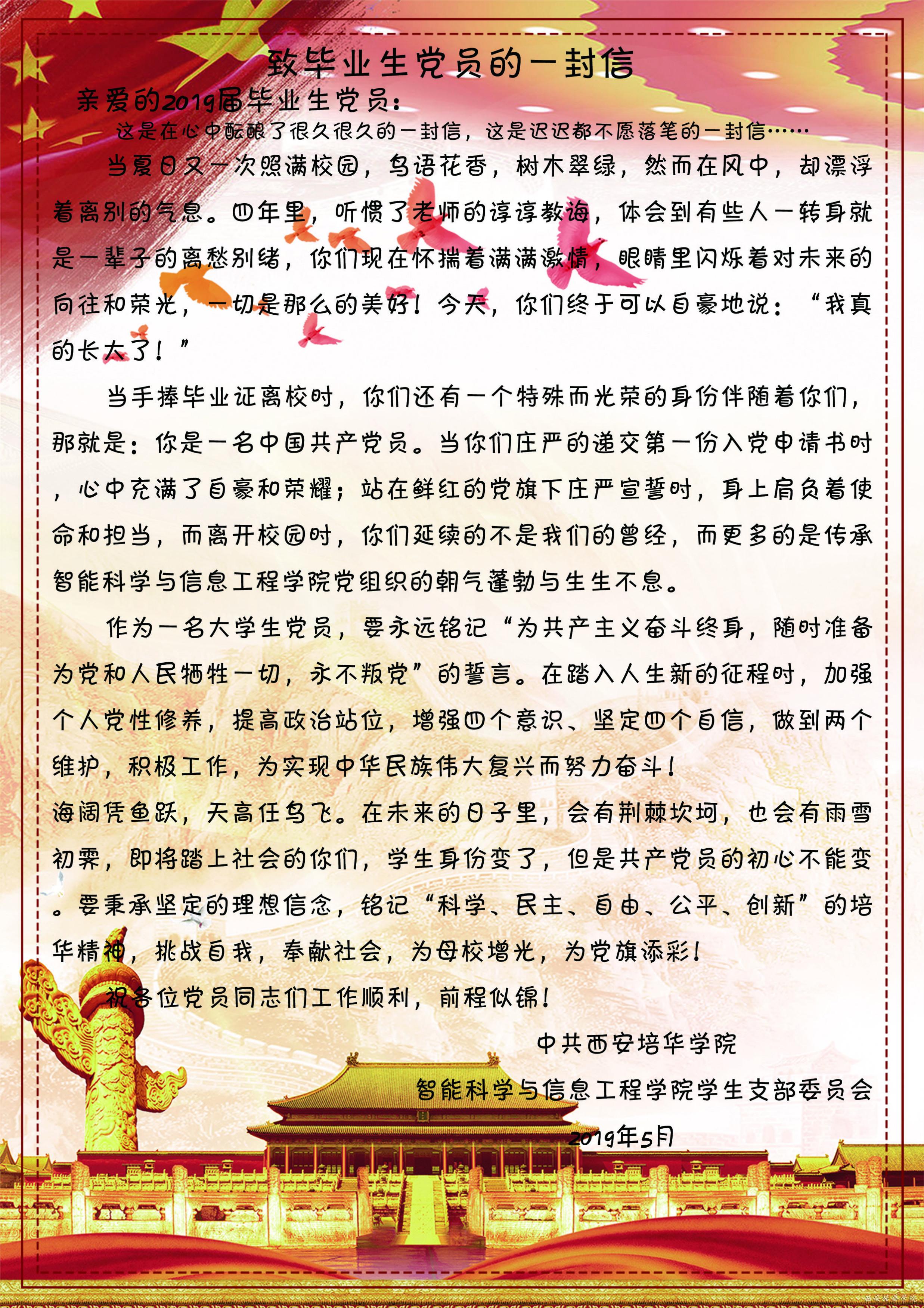我院党支部制作了《致毕业生党员的一封信》,信中寄出了我院党支部对毕业生党员的殷切希望,希望毕业生党员能牢记校风、校训,用“青春梦”托起“中国梦”,以更加优异的成绩为党旗增辉,为母校添彩。母校恩情深似海,由毕业生党员代表刘鑫亮将绣有“党恩浩荡沐春风 培华桃李满天下 ”的锦旗赠与我院党总支,以表达近几年学校对学子进行红色教育的感谢之意。
