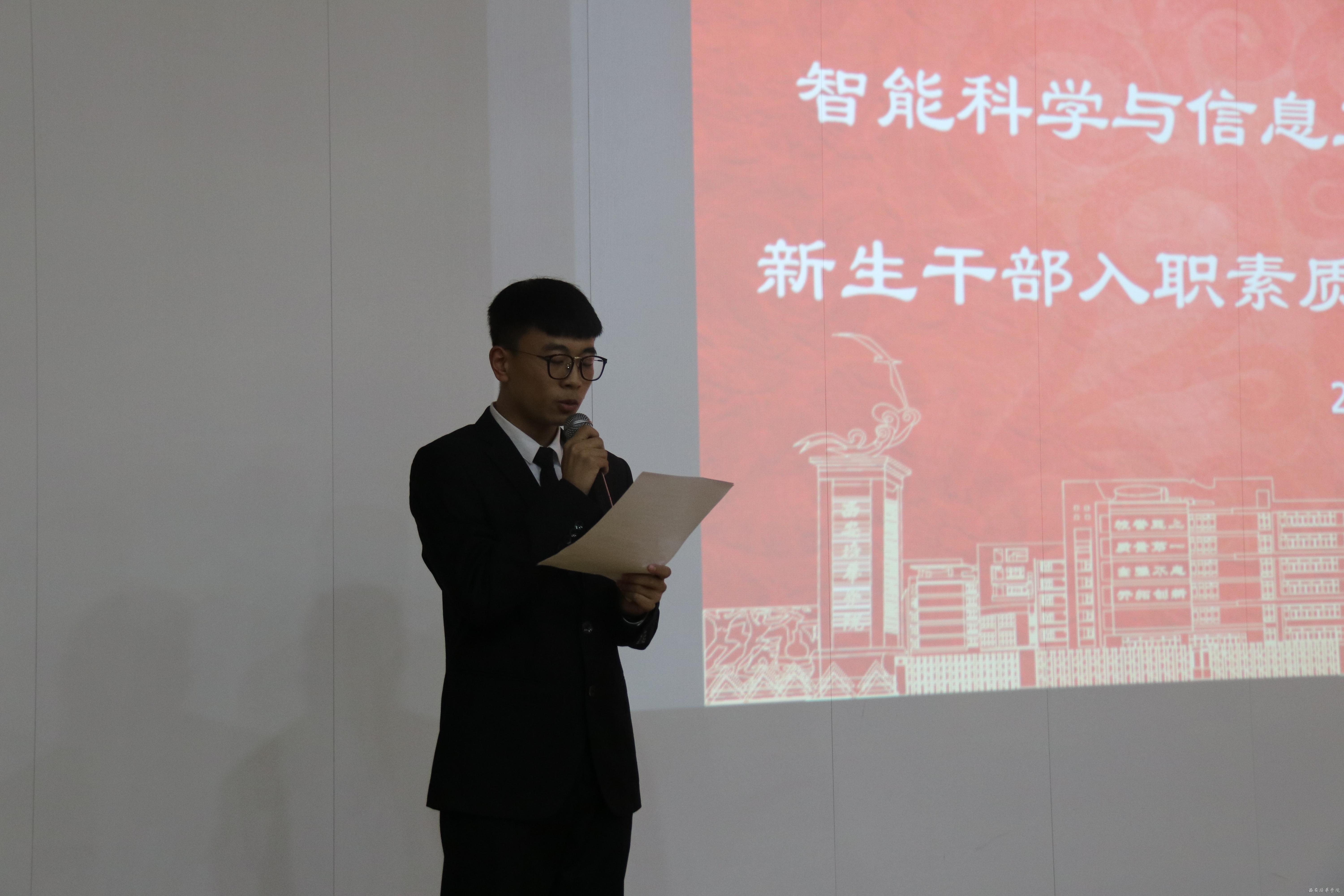 学生会主席蔡志远宣读《干部自律公约》。为建设一支胸怀理想、心系同学、品学兼优、作风扎实的工作骨干队伍,共同维护组织形象,更好履行工作职责,我们要恪守学生本分,带头学习;牢记学生组织宗旨;永葆理想主义情怀,甘于奉献;扎扎实实做事,求真务实;营造平氛围,坚决反对“官”本位思想和作风;摒弃庸俗习气,坚决抵制社会不良习气侵蚀。
