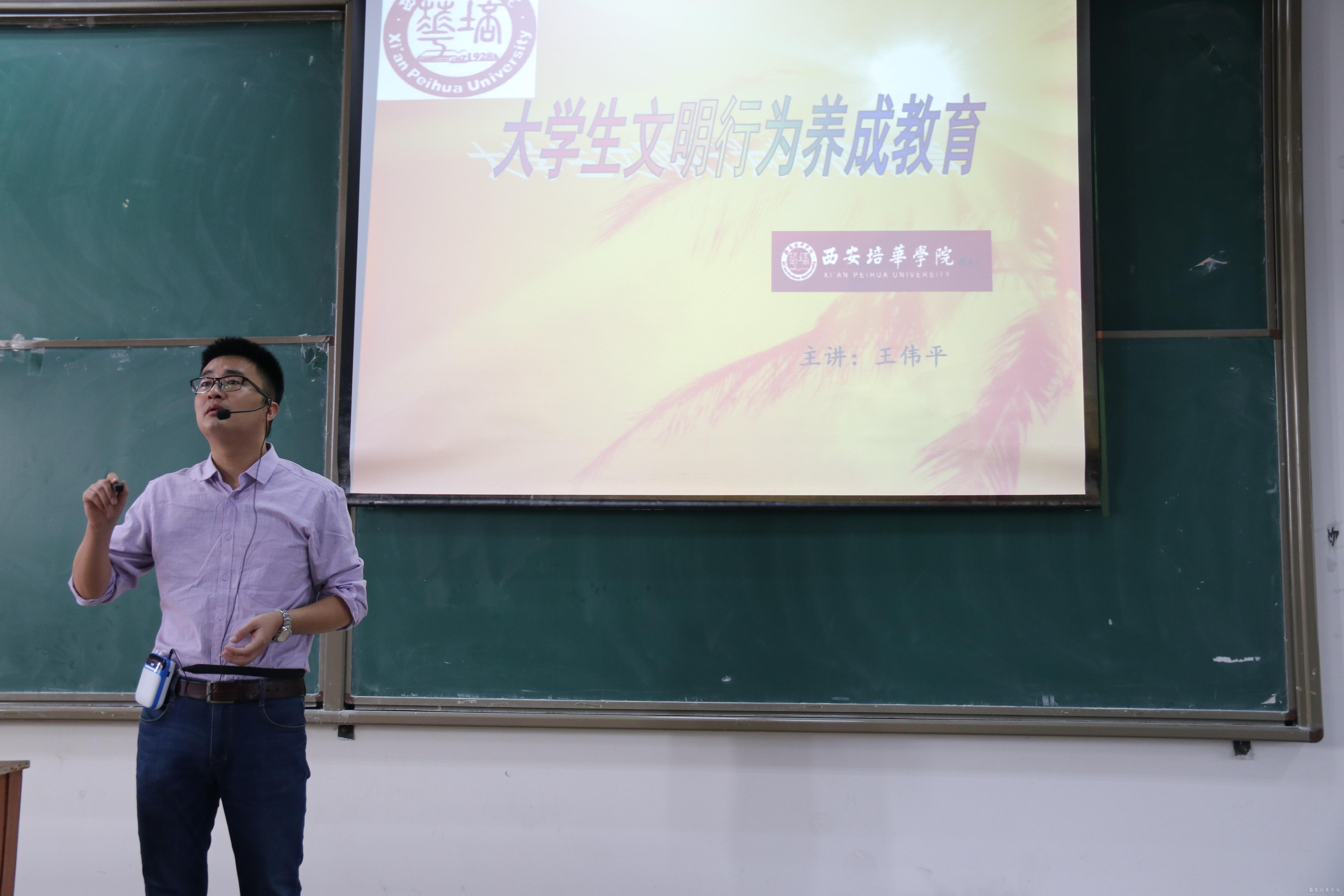 王伟平老师从大学生中普遍存在的不良现象如:自我管理、自我服务能力差;独立生活能力差,依赖心理强;以自我为中心的价值观念突出;缺乏学习的主动性;行为散漫,纪律意识淡漠;消费观念超前,攀比心理强;缺乏远大理想,处事急躁、功利;自我调控能力差;团队意识和社会责任感低等方面对新生们提出了新的要求,要严格遵守《西安培华学院校园文明十禁止》、严格执行《西安培华学院学生手册》中的各项规章制度,通过参与各项养成教育活动,不断明晰学习目标、了解学习方法、掌握专业知识,树立正确的世界观、人生观和价值观,以社会主义核心价值观为引领,提升自身思想道德水平,加强自律、自省、自我教育,做文明、守纪、明礼、知行、上进、守法的合格大学生。