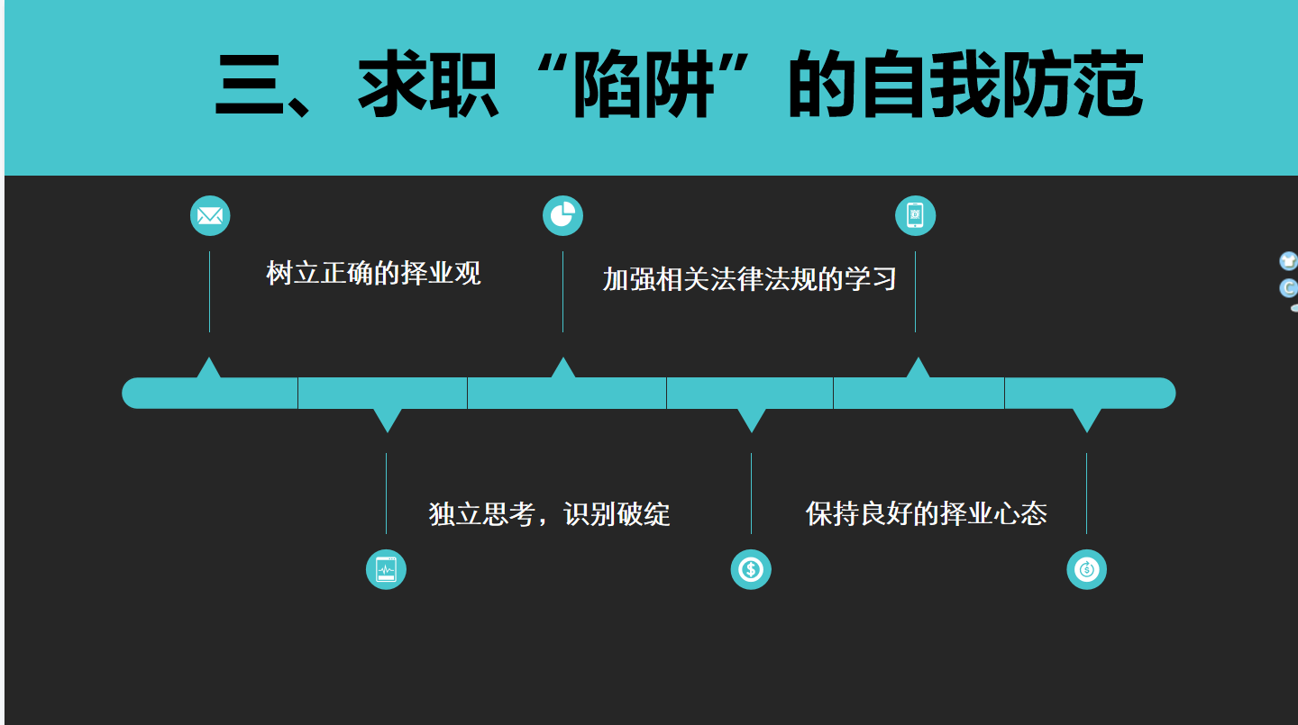 针对以上特征,程老师教学了“陷阱”如何进行自我防患。培养自己相关的法律法规,仔细辨别就业信息的真实性,一定有自己的规划,不应盲目从众,确认就业单位的资质,面试时多观察观察,请勿相信缴费、交证,发现被骗,及时进行报案处理。