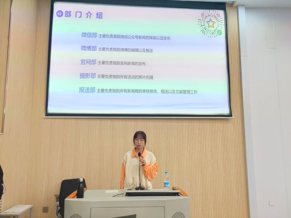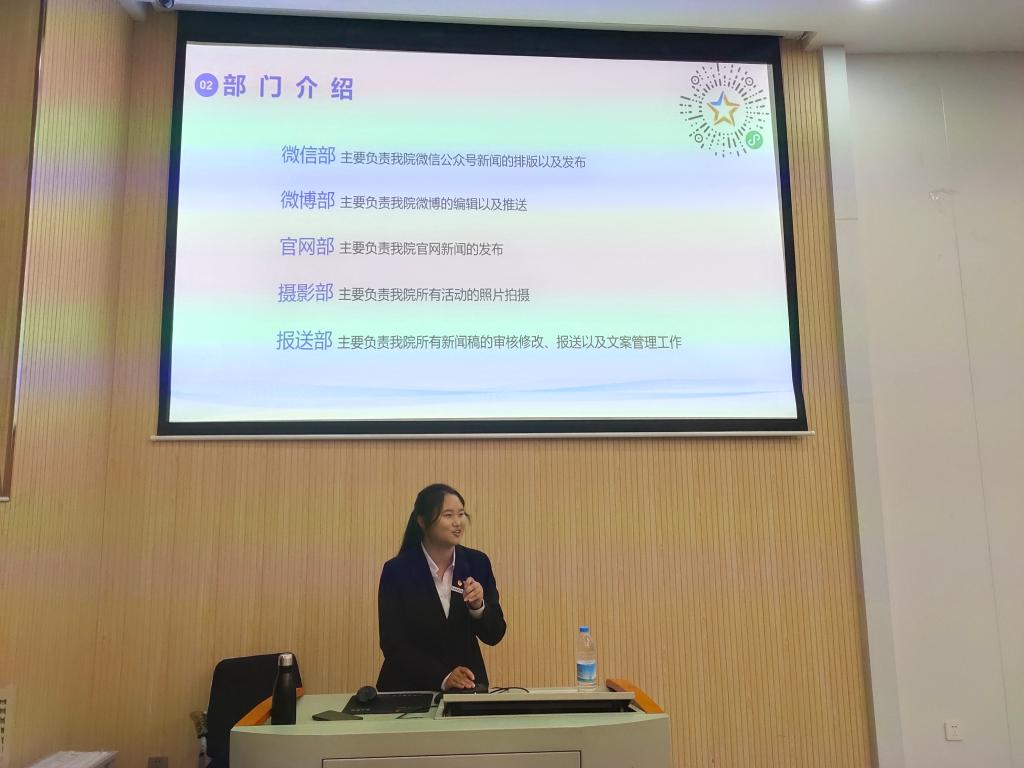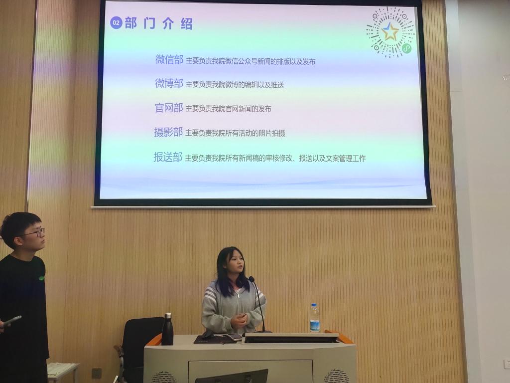 在会议初始站长就告诉在场所有新生;“新闻的闻是指的是听见的事情,消息,也指出名,有声望。我们作为一名新闻工作者以保证新闻的真实、公开、时效、准确为首要核心。”随后简要概述了,新闻站共包括办公室、微信部、微博部、官网部、摄影部五大部门以及相应部门职责。