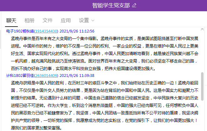 学院党总支副书记王林:“月是故乡明,心安是归途。”来自孟晚舟女士的归国感言让所有人深信,一个伟大而繁荣昌盛的中国矗立在世界的东方,实现中华民族伟大复兴进入了不可逆转的历史进程。我们每一名优秀的共产党员,都应该更加自觉地砥砺强国之志,共筑伟大的中国梦。