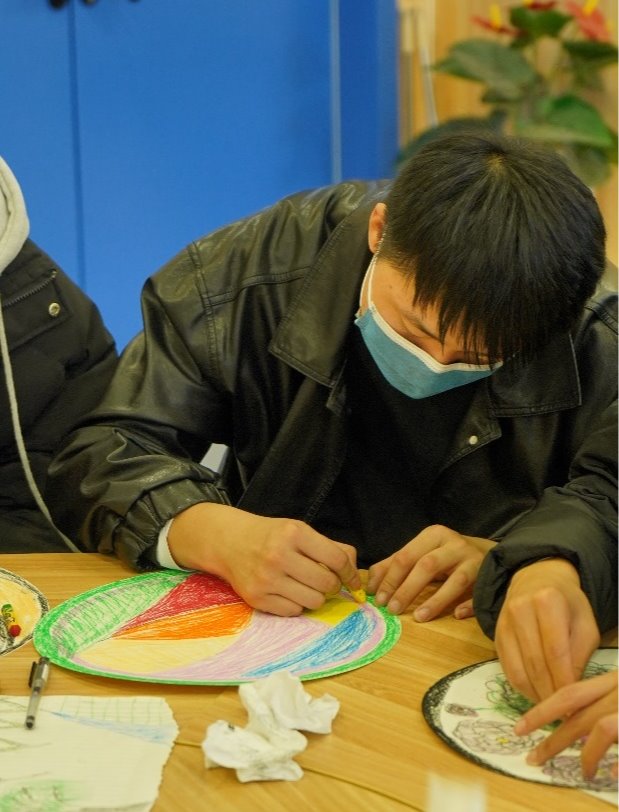 之后,高老师为每位同学分发了圆形卡纸,并让每个同学用自己最喜欢的颜色将卡纸外圈涂满并在卡纸上画出自己的能量意向。同学们也在自由自在无拘无束中,完全尊重自身心灵运行规律披露心意抒写心意,进行曼陀罗绘画。