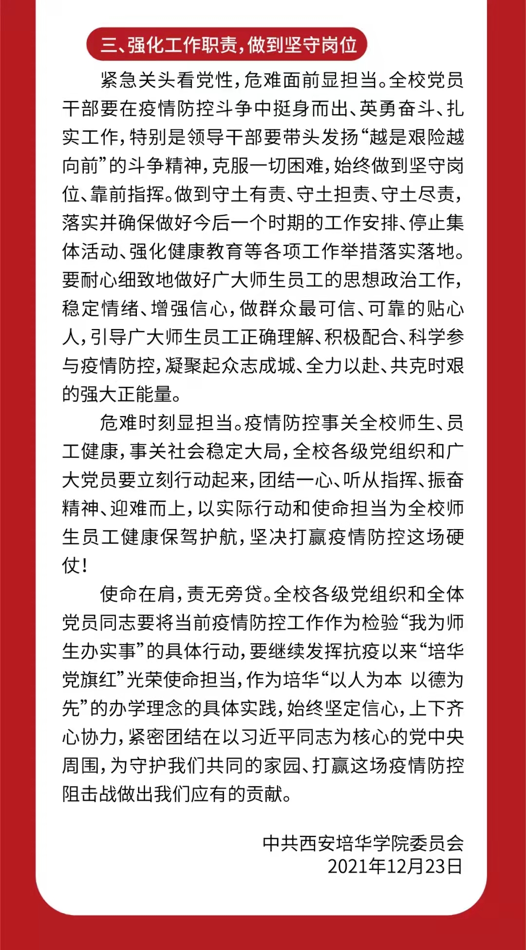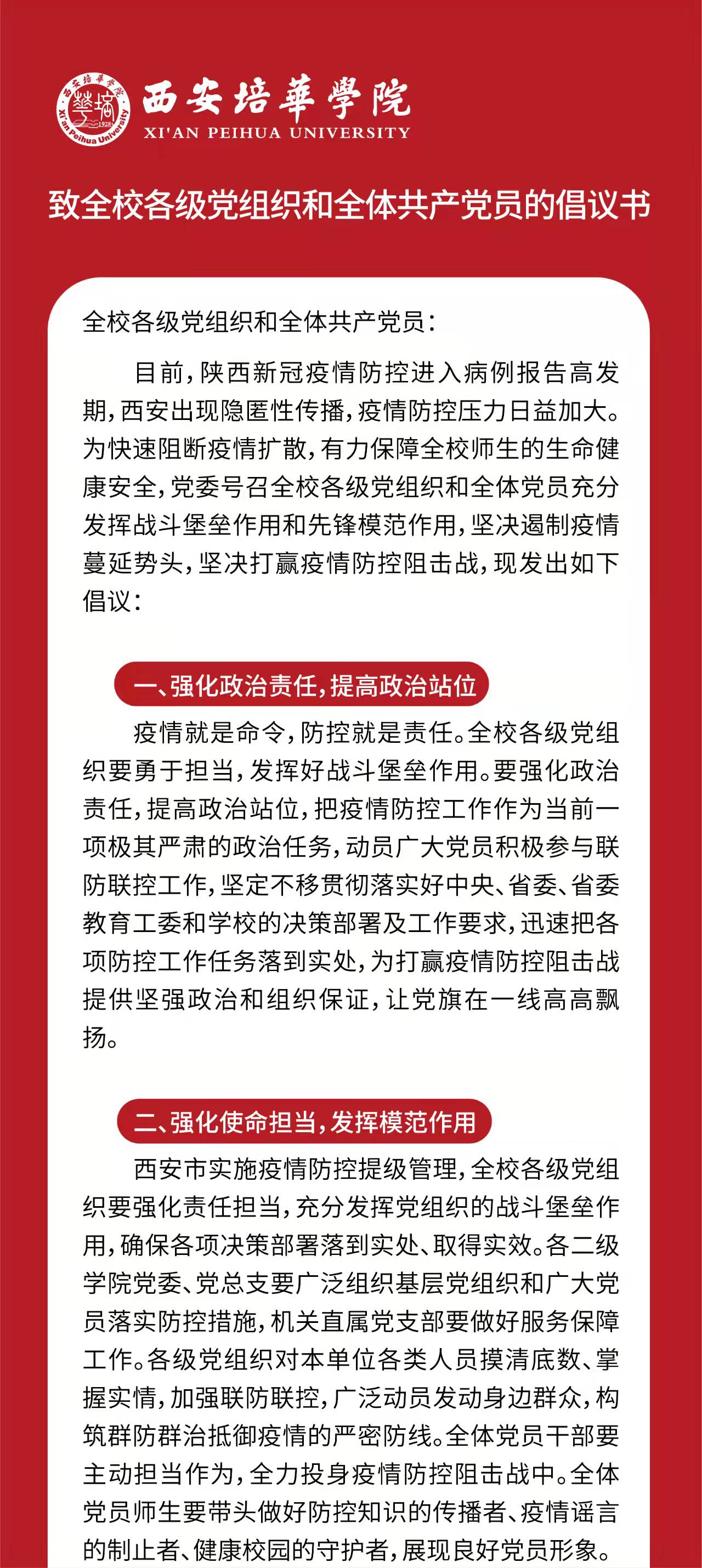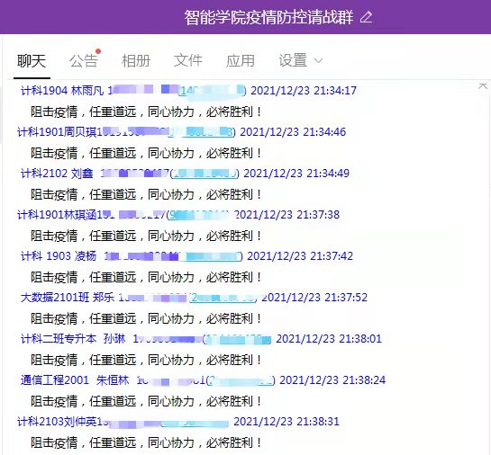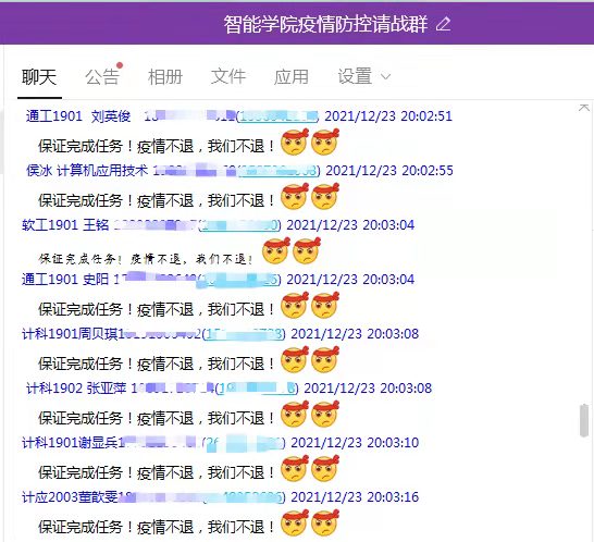智能学院全体师生党员充分认识到当前疫情防控的严峻性艰巨性,坚决做到“疫情防控‘七带头’,我是党员我先行”:带头扛起硬核担当、带头驰援基层一线、带头关心关爱群众、带头做好自身防护、带头落实管控措施、带头做好舆论引导、带头严守纪律规定。并按照西安培华学院党委《致全校各级党组织和全体共产党员的倡议书》,强化政治责任,提高政治站位;强化使命担当,发挥模范作用;强化工作职责,做到坚守岗位,团结一心、听从指挥、振奋精神、迎难而上,以实际行动和使命担当,坚决打赢疫情防控这场硬仗!
