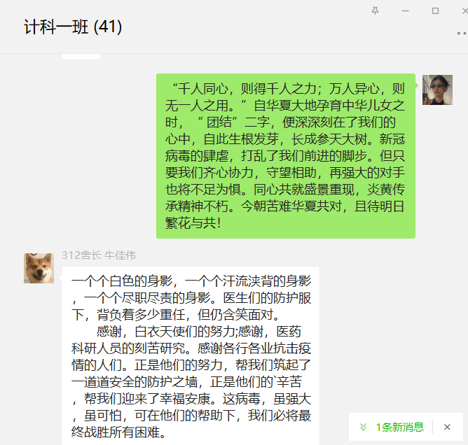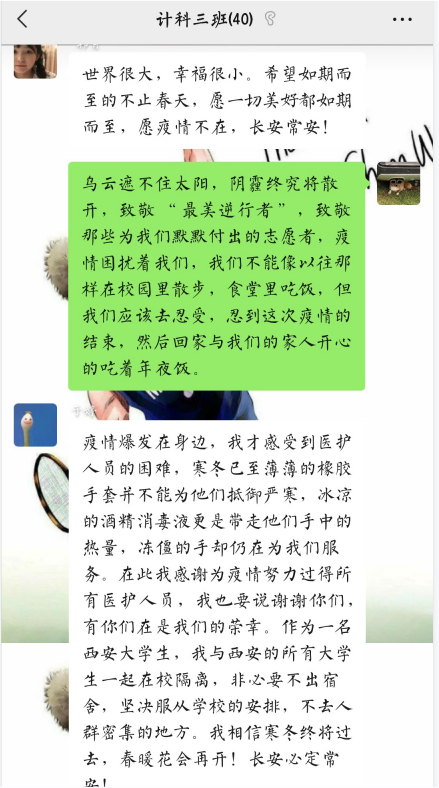 软件工程2002班张玉清:在此次疫情中,有很多人都在为此默默付出,他们在此次疫情做出了很多贡献,我很敬佩他们,虽然我并不能像他们一样做出那么多的贡献,但是我会积极配合并协助防疫工作,并约束自己在这段时间里努力学习提升自我,最后我想说,希望此次疫情可以很快过去,西安加油!长安加油!我们终将迎来黎明!