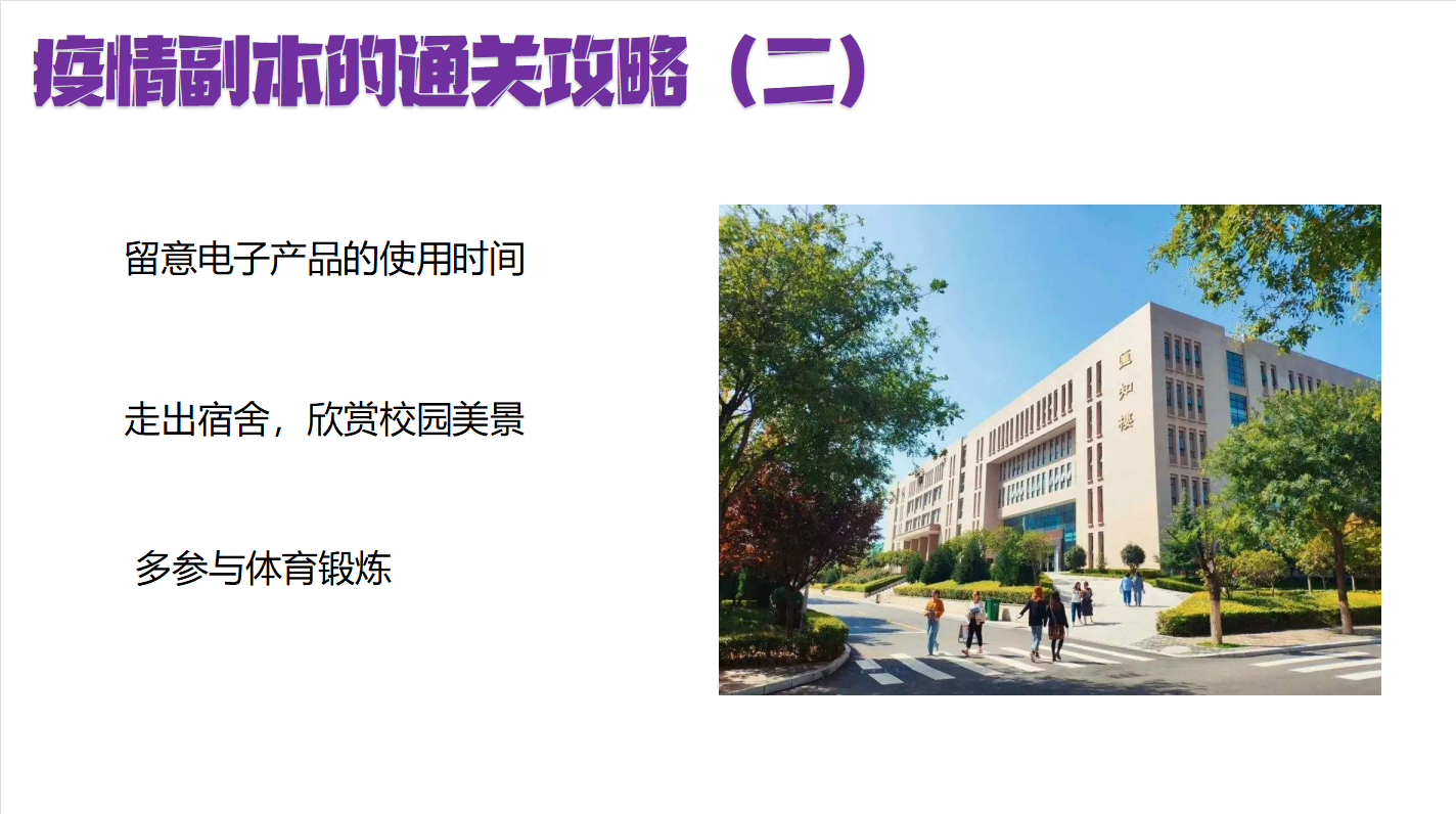 新冠来袭,新的游戏副本关卡,疫情副本给同学们的生命游戏带来了学习、生活、人际交往方面的变化,但同时也成为了成长的契机,要学会对疫情有合理的预期,同时接纳自己的负面情绪,才能更好应对现在疫情的挑战。