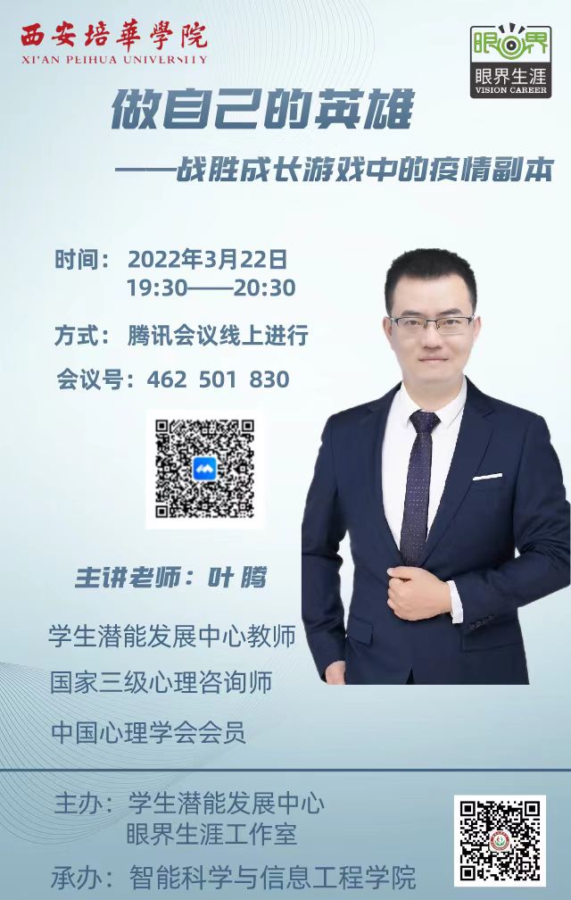 2022年3月22日晚,由学生生涯潜能发展中心眼界生涯工作室主办,智能科学与信息工程学院协办《做自己的英雄--战胜成长游戏中的疫情副本》在叶腾老师的精彩分享中开始了,本次会议由智能科学与信息工程学院心理健康教师高珊珊老师主持。谚语说道:“我们的人生就像一场游戏,总是充满未知与挑战,这个过程中享受着游戏的乐趣,同时收获经验与成长的果实。”