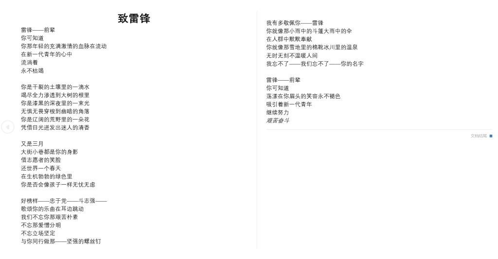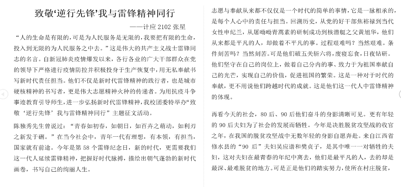 “人的生命是有限的,可是为人民服务是无限的,我要把有限的生命,投入到无限的为人民服务之中去。”这是伟大的共产主义战士雷锋同志的名言。自新冠肺炎疫情暴发以来,各行各业的广大干部群众在党的领导下严格进行疫情防控并积极投身于生产恢复中,用无私奉献书写新时代责任担当。他们不仅是新时代雷锋精神的践行者,也是城市硬核精神的书写者,更是伟大志愿精神火种的传递者。为用抗疫斗争事迹教育引导师生,进一步弘扬新时代雷锋精神,我校智能科学与信息工程学院青年志愿者协会开展了以“学习雷锋精神”为主题的在线征稿活动。