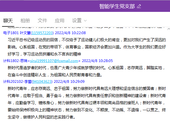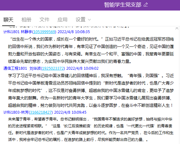 计算机科学与技术1801班林静宇:“出生在一个伟大的国家,成长在一个最好的时代。”正如习近平总书记在给奥运冠军苏翊鸣的回信中所说,我们作为新时代青年,见证了中国的蓬勃力量和开放包容的大国姿态。我们青年更要延续革命先辈的意志,为实现中华民族伟大复兴贡献出我们的青春力量。