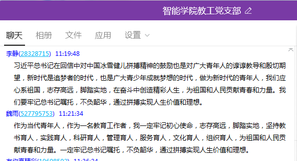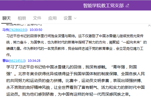 党总支书记兼行政副院长南兵:学习了习近平总书记给中国冰雪健儿的回信,我深有感触。新时代是奋斗者的时代,用汗水浇灌青春梦想,用奋斗的青春和行动去响应党的号召,树立与这个时代同心同向的理想信念,在奋斗中绽放青春光芒。我们要增强责任感、使命感、荣誉感,要不忘初心、牢记使命。