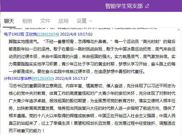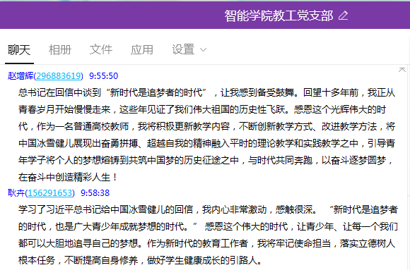 党总支统战委员张燕:正如习近平总书记所说,冰雪健儿在奋斗中创造精彩人生,为祖国和人民贡献青春和力量!作为一名教师,我也要做到脚踏实地工作,教好书育好人,牢记“心系祖国,奋进逐梦,志存高远,不负使命”!