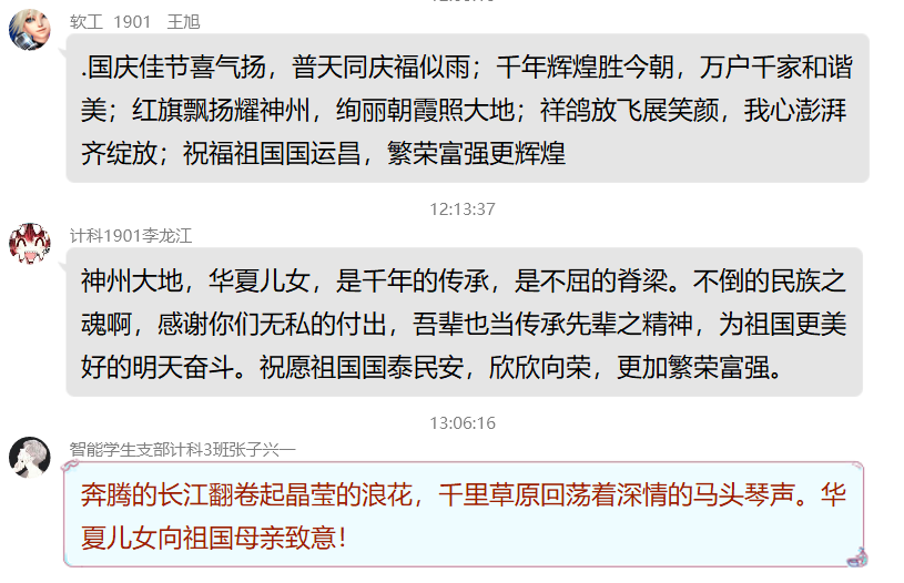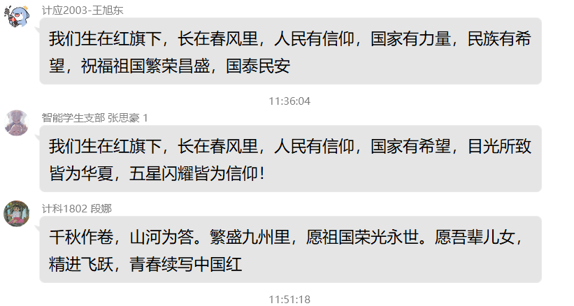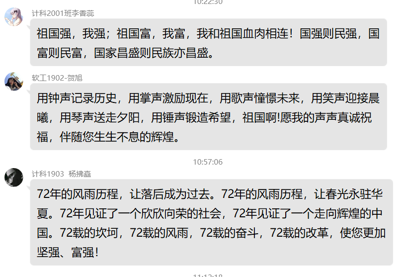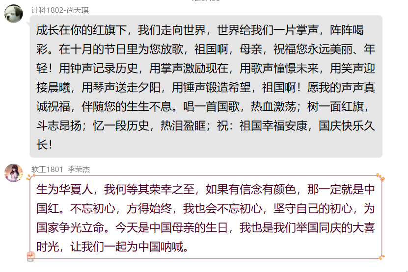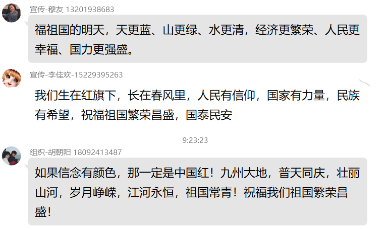 红红爱国心,浓浓国旗情。他们用镜头和言语表达了对祖国的无限热爱,他们用行动诠释着自己对祖国母亲的热爱,一张张洋溢着笑容的脸颊,一幅幅创意无限的照片,一句句饱含真情的祝福,无不诉说着一句:“祖国,生日快乐!”