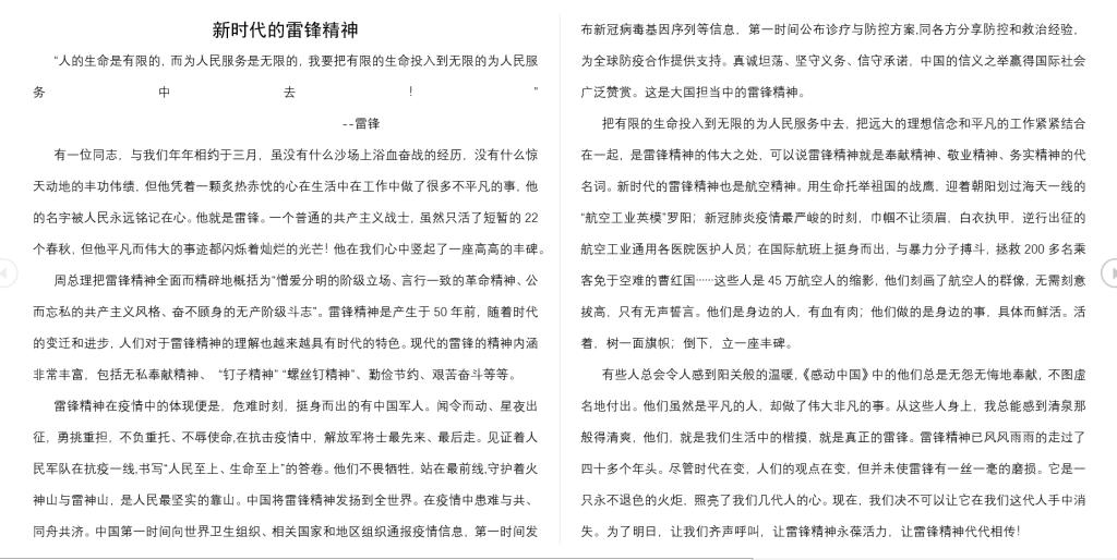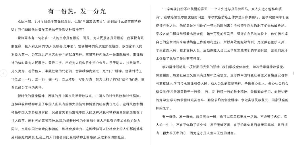 “人的生命是有限的,可是为人民服务是无限的,我要把有限的生命,投入到无限的为人民服务之中去。”这是伟大的共产主义战士雷锋同志的名言。自新冠肺炎疫情暴发以来,各行各业的广大干部群众在党的领导下严格进行疫情防控并积极投身于生产恢复中,用无私奉献书写新时代责任担当。他们不仅是新时代雷锋精神的践行者,也是城市硬核精神的书写者,更是伟大志愿精神火种的传递者。为用抗疫斗争事迹教育引导师生,进一步弘扬新时代雷锋精神,我校智能科学与信息工程学院青年志愿者协会开展了以“学习雷锋精神”为主题的在线征稿活动。