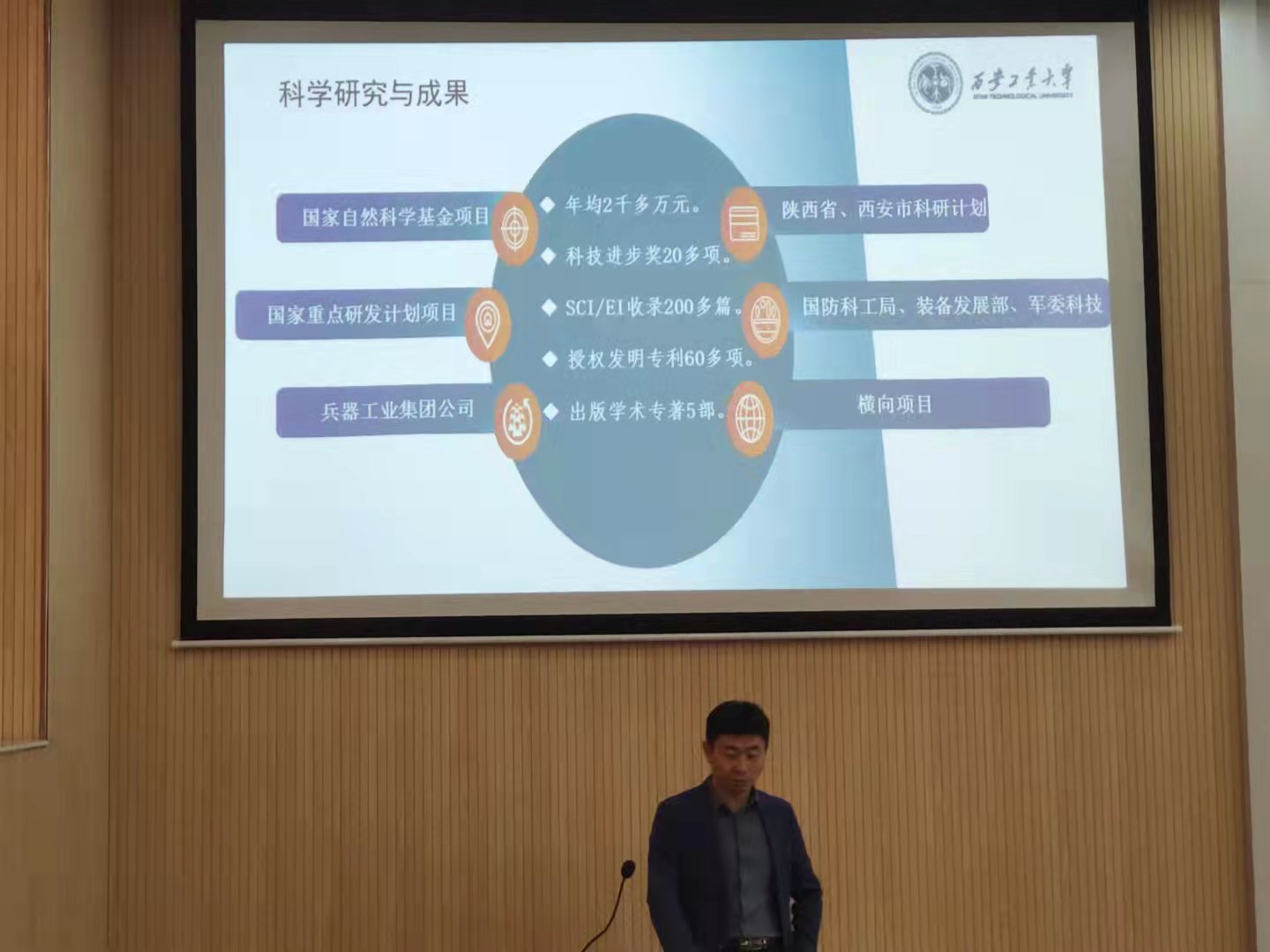 首先,闫克丁副教授就西安工业大学的学科特色、导师队伍、国际交流、考研团队、研究生培养及就业进行了讲解。接着就研究方向和研究所硕士培养模式进行了介绍。再针对考研前的准备做出了相关的指导。向同学们讲述了如何有效高效地获取考研信息,并结合自身多年的经验告诉同学们导师更倾向于选择什么样的学生。