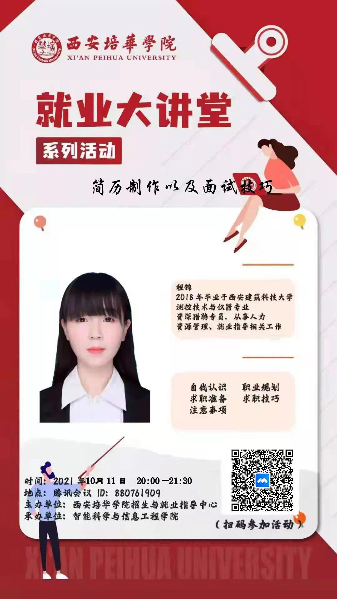 为进一步推动2022届毕业生就业指导工作,帮助毕业生了解就业形势,提高就业素质,我院特邀请陕西公众智能科技有限公司程锦老师于2021年10月11日20:00,为我院2022届毕业生作就业指导工作,此次讲座由我院就业专干杨桂锋老师主持。